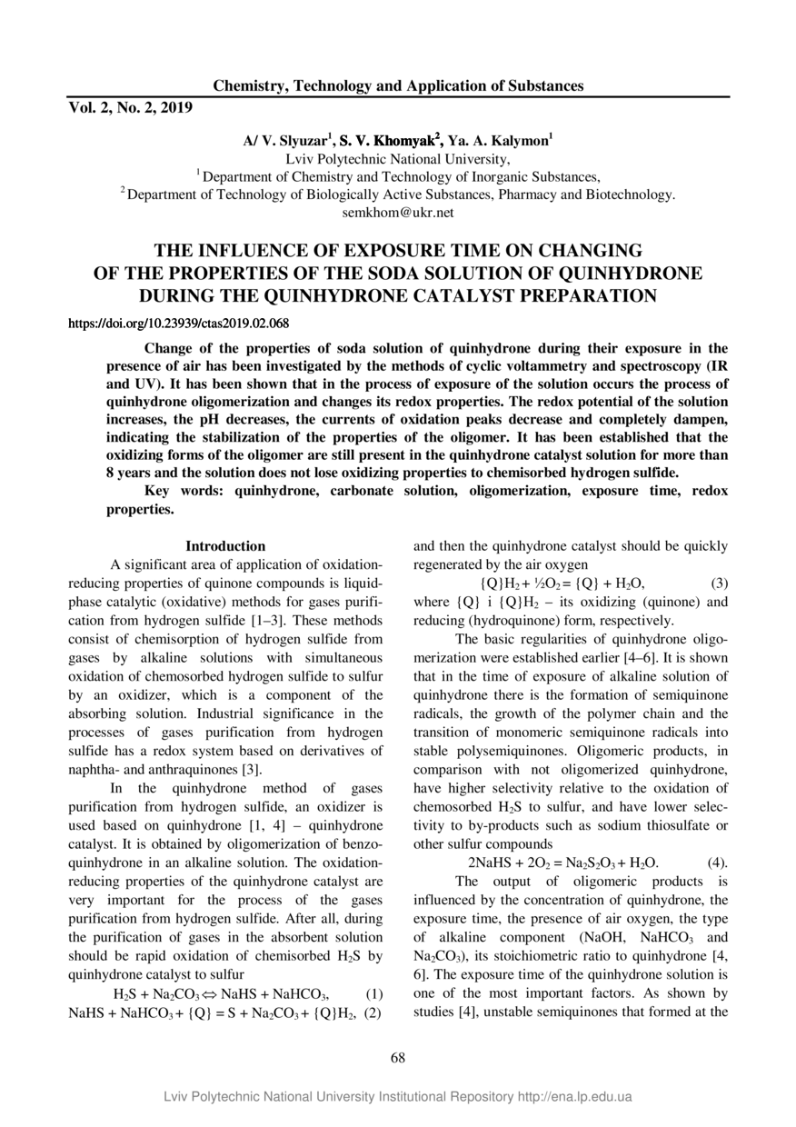Slyuzar A. V. The influence of exposure time on changing of the properties of the soda solution of quinhydrone during the quinhydrone catalyst preparation / A. V. Slyuzar, S. V. Khomyak, Ya. A. Kalymon // Chemistry, Technology and Application of Substances. — Lviv : Lviv Politechnic Publishing House, 2019. — Том 2. — № 2. — С. 68–72.