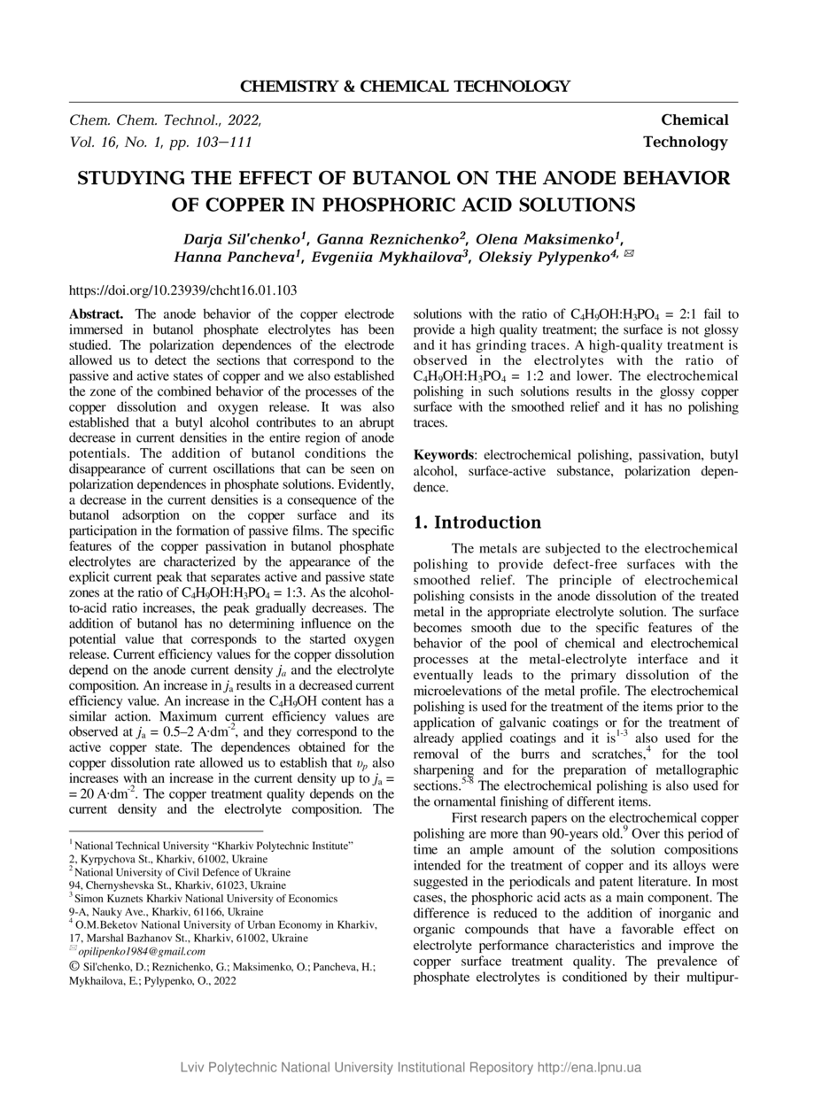 Studying the Effect of Butanol on the Anode Behavior of Copper in Phosphoric Acid Solutions / Darja Sil'chenko, Ganna Reznichenko, Olena Maksimenko, Hanna Pancheva, Evgeniia Mykhailova, Oleksii Pylypenko // Chemistry & Chemical Technology. — Lviv : Lviv Politechnic Publishing House, 2022. — Vol 16. — No 1. — P. 103–111.