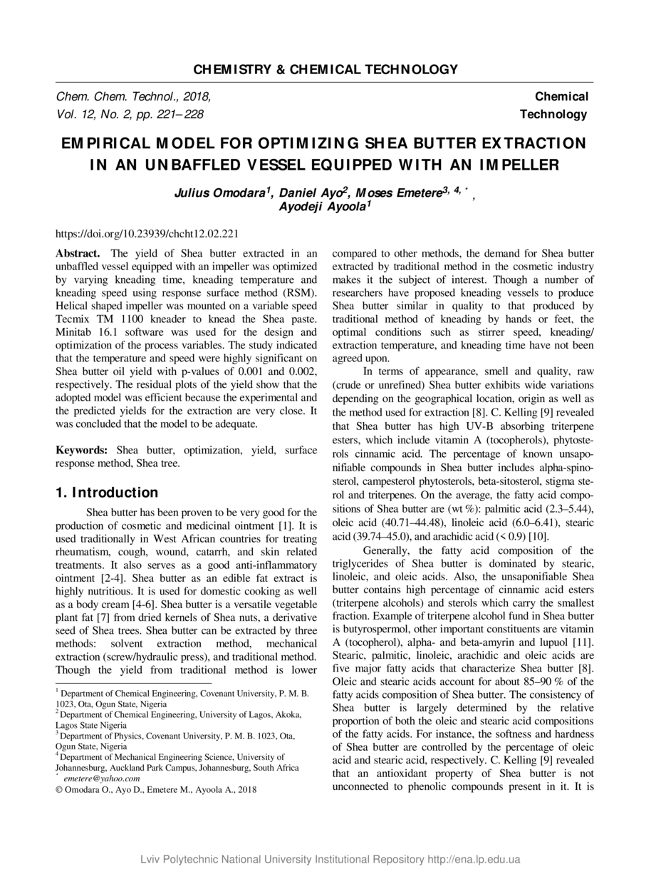 Empirical model for optimizing shea butter extraction in an unbaffled vessel equipped with an impeller / Julius Omodara, Daniel Ayo, Moses Emetere, Ayodeji Ayoola // Chemistry & Chemical Technology. — Lviv : Lviv Politechnic Publishing House, 2018. — Vol 12. — No 2. — P. 221–228.