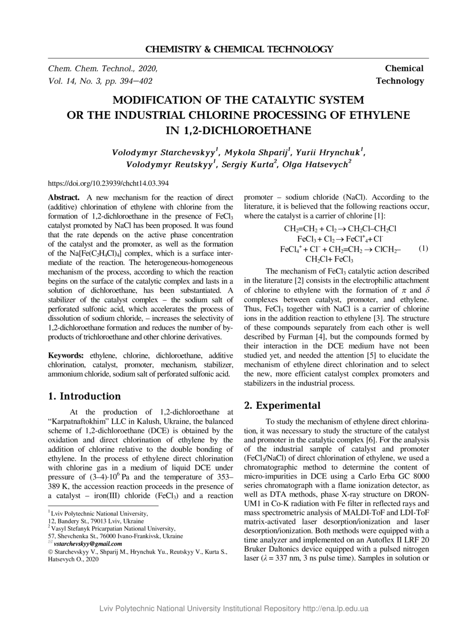Modification of the Catalytic System for the Industrial Chlorine Processing of Ethylene in 1,2-Dichloroethane / Volodymyr Starchevskyy, Mykola Shparij, Yurii Hrynchuk, Volodymyr Reutskyy, Sergiy Kurta, Olga Hatsevych // Chemistry & Chemical Technology. — Lviv : Lviv Politechnic Publishing House, 2020. — Vol 14. — No 3. — P. 394–402.