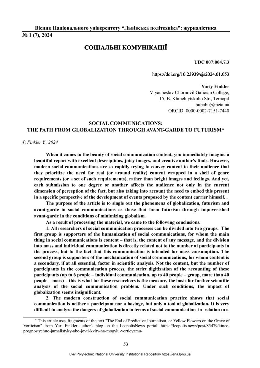 Finkler Y. Social communications: the path from globalization through avant-garde to futurism / Yuriy Finkler // Вісник Національного університету “Львівська політехніка”. Серія: журналістика. — Lviv : Lviv Politechnic Publishing House, 2024. — No 1 (7). — P. 53–58.