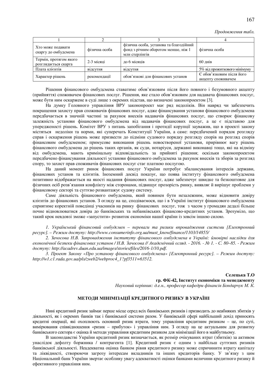 Селецька Т. О. Методи мінімізації кредитного ризику в Україні / Т. О. Селецька, М. К. Бондарчук // 76-та Студентська науково-технічна конференція. Секція "Економіка і менеджмент" : збірник тез доповідей, жовтень – листопад 2018 року. — Львів : Видавництво Львівської політехніки, 2018. — С. 167–168. — (Проблеми розвитку фінансового ринку).