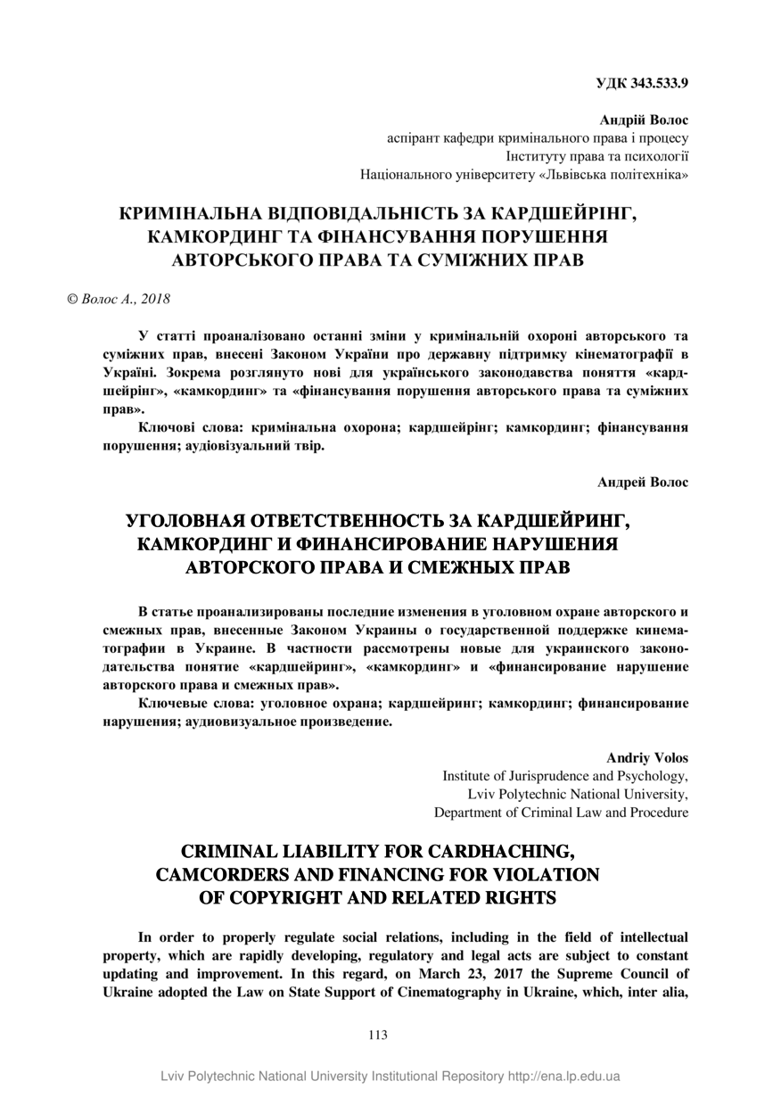 Волос А. Кримінальна відповідальність за кардшейрінг, камкординг та фінансування порушення авторського права та суміжних прав / Андрій Волос // Вісник Національного університету “Львівська політехніка”. Серія: Юридичні науки. — Львів : Видавництво Львівської політехніки, 2018. — № 902 (19). — С. 113–119.