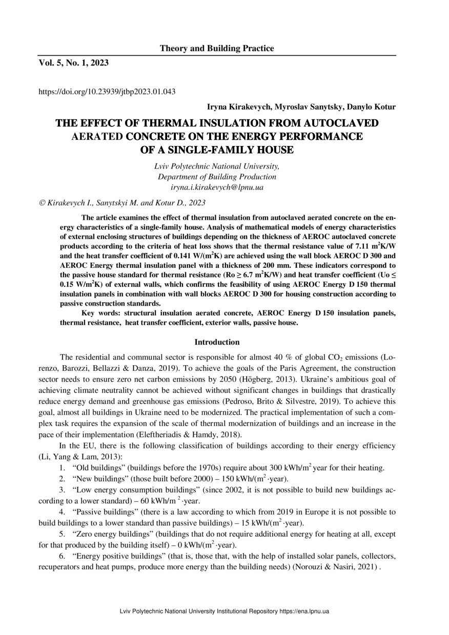 | dc.identifier.citationen | Kirakevych I. The effect of thermal insulation from autoclaved aerated concrete on the energy performance of a single-family house / I. Kirakevych, M. Sanytsky, D. Kotur // Theory and Building Practice. — Lviv : Lviv Politechnic Publishing House, 2023. — Vol 5. — No 1. — P. 43–48. | |