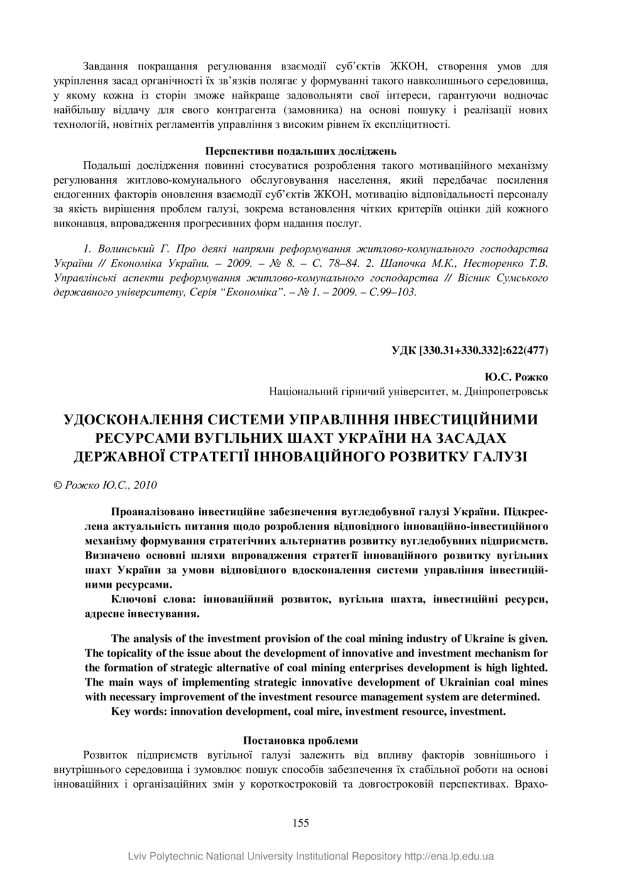 Рожко Ю. С. Удосконалення системи управління інвестиційними ресурсами вугільних шахт України на засадах державної стратегії інноваційного розвитку галузі / Ю. С. Рожко // Вісник Національного університету “Львівська політехніка”. — Львів : Видавництво Львівської політехніки, 2010. — № 668 : Проблеми економіки та управління. — С. 155–159.