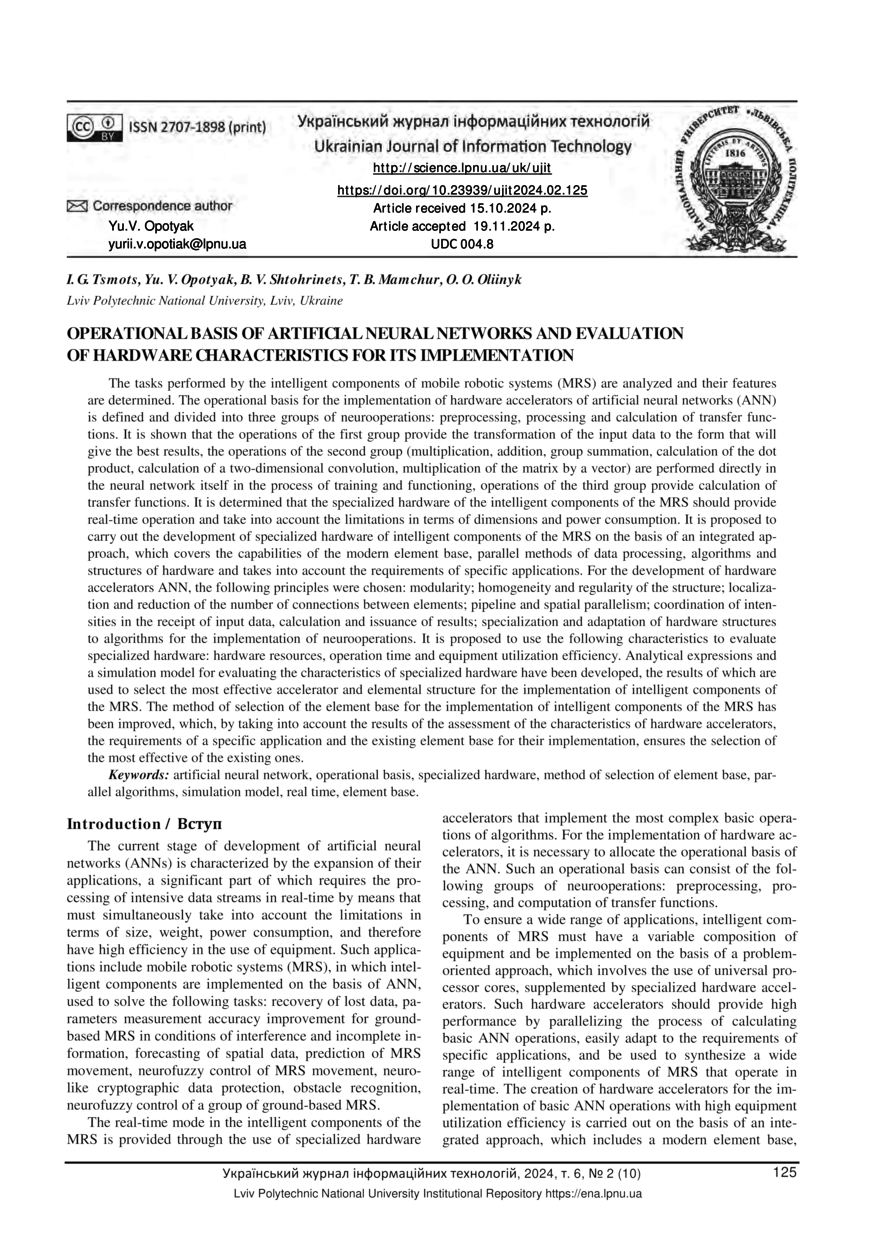 Operational basis of artificial neural networks and evaluation of hardware characteristics for its implementation / I. G. Tsmots, Yu. V. Opotyak, B. V. Shtohrinets, T. B. Mamchur, O. O. Oliinyk // Ukrainian Journal of Information Technology. — Lviv : Lviv Politechnic Publishing House, 2024. — Vol 6. — No 2. — P. 125–138.