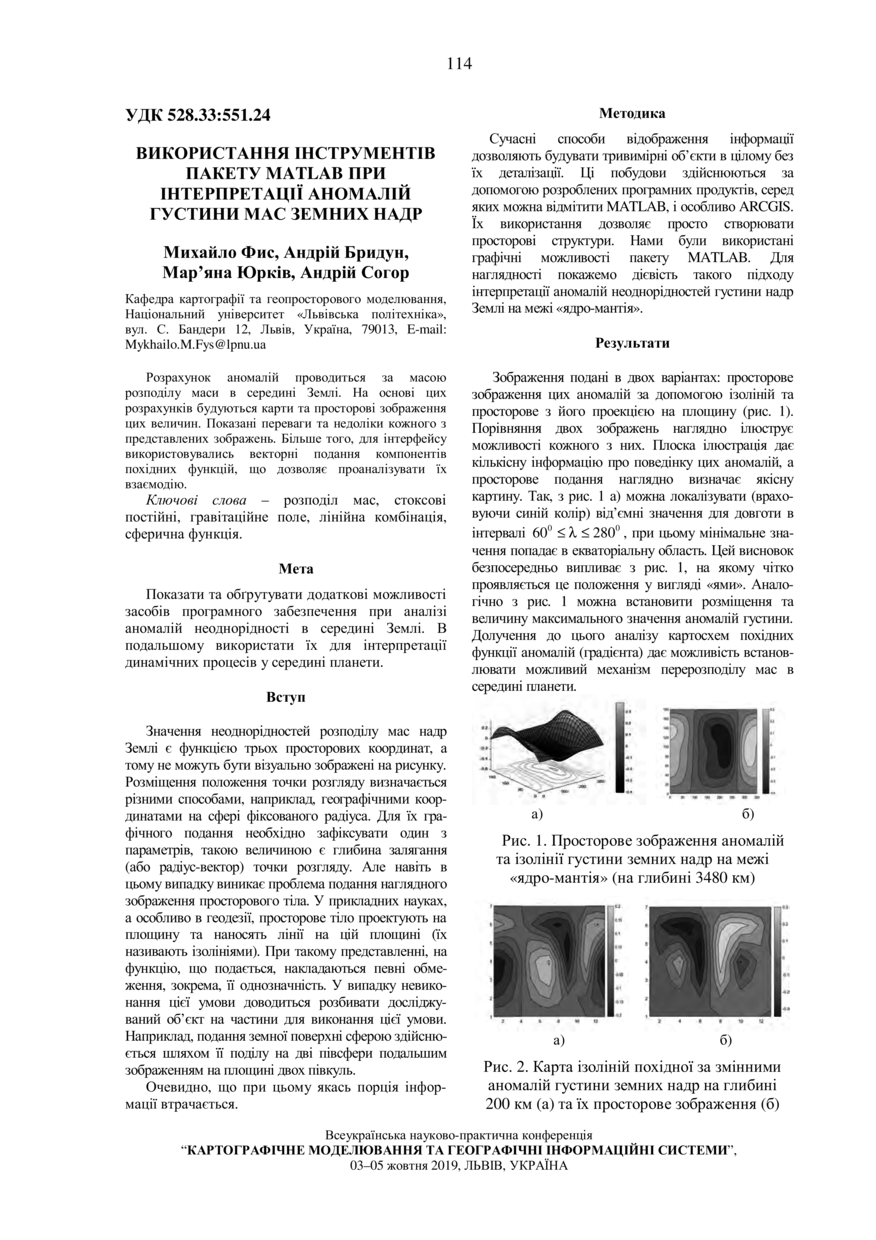 Використання інструментів пакету MATLAB при інтерпретації аномалій густини мас земних надр / Михайло Фис, Андрій Бридун, Мар’яна Юрків, Андрій Согор // Картографічне моделювання та географічні інформаційні системи : збірник матеріалів всеукраїнської науково-практичної конференції, 3–5 жовтня 2019 року, Львів. — Львів : Видавництво Львівської політехніки, 2019. — С. 114–115.