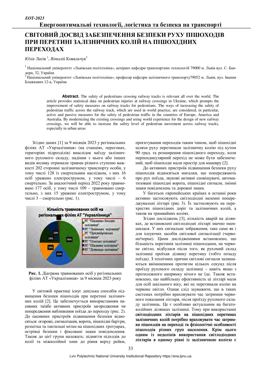 Лесів Ю. Світовий досвід забезпечення безпеки руху пішоходів при перетині залізничних колій на пішохідних переходах / Юлія Лесів, Віталій Ковальчук // Енергооптимальні технології, логістика та безпека на транспорті : матеріали 3-ї Міжнародної науково-практичної конференції, 9-10 листопада 2023 року. — Львів : Видавництво Львівської політехніки, 2023. — С. 33–35.
