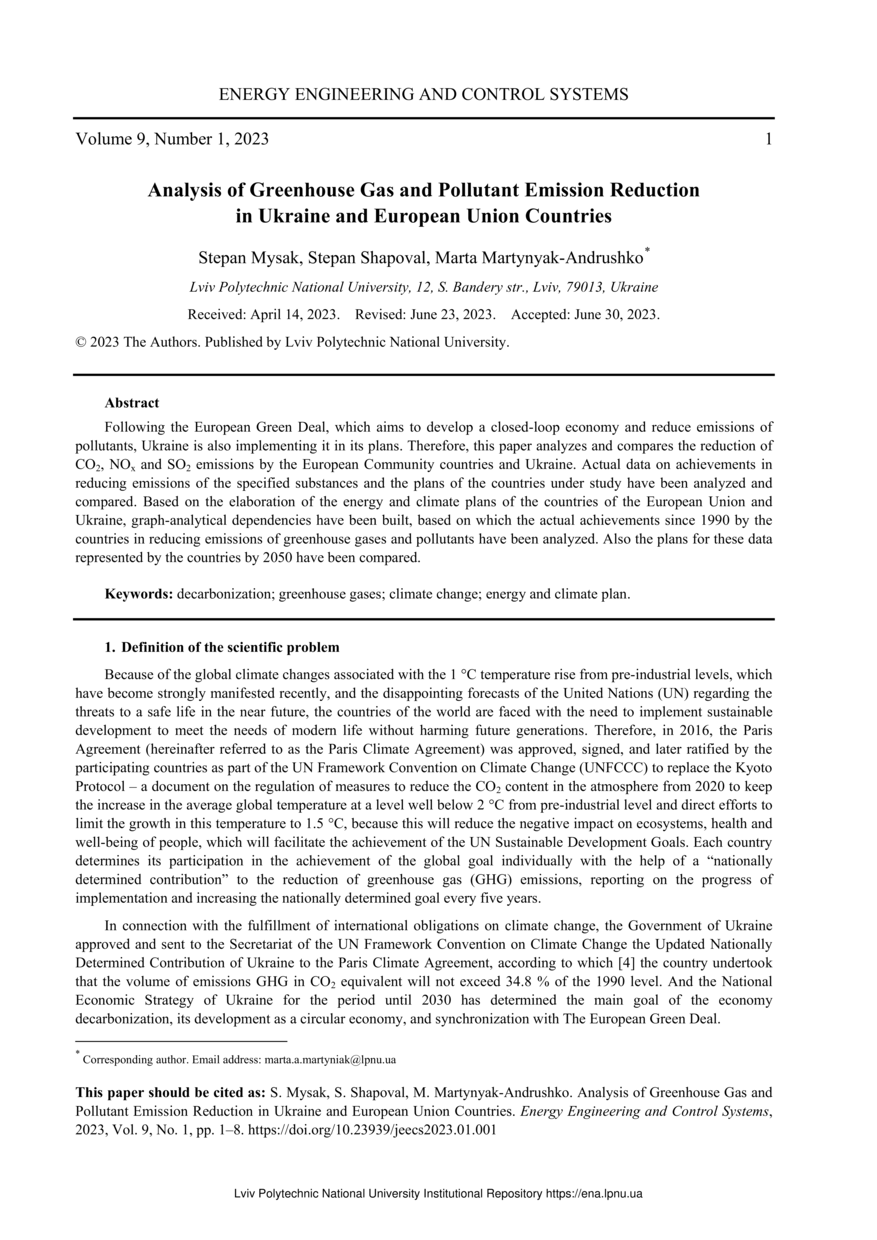 Mysak S. Analysis of Greenhouse Gas and Pollutant Emission Reduction in Ukraine and European Union Countries / Stepan Mysak, Stepan Shapoval, Marta Martynyak-Andrushko // Energy Engineering and Control Systems. — Lviv : Lviv Politechnic Publishing House, 2023. — Vol 9. — No 1. — P. 1–8.