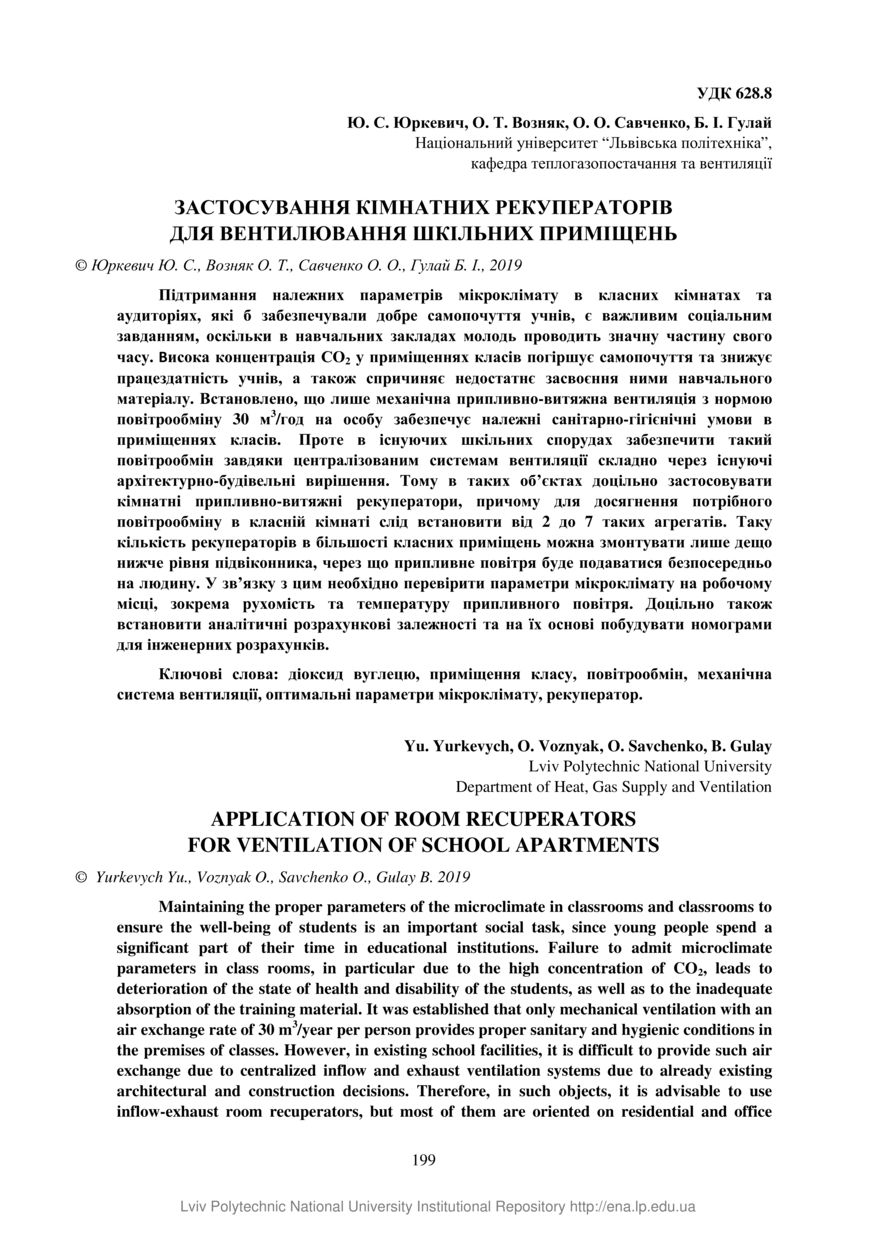 Застосування кімнатних рекуператорів для вентилювання шкільних приміщень / Ю. С. Юркевич, О. Т. Возняк, О. О. Савченко, Б. І. Гулай // Вісник Національного університету “Львівська політехніка”. Серія: Теорія і практика будівництва. — Львів : Видавництво Львівської політехніки, 2019. — № 912. — С. 199–207.