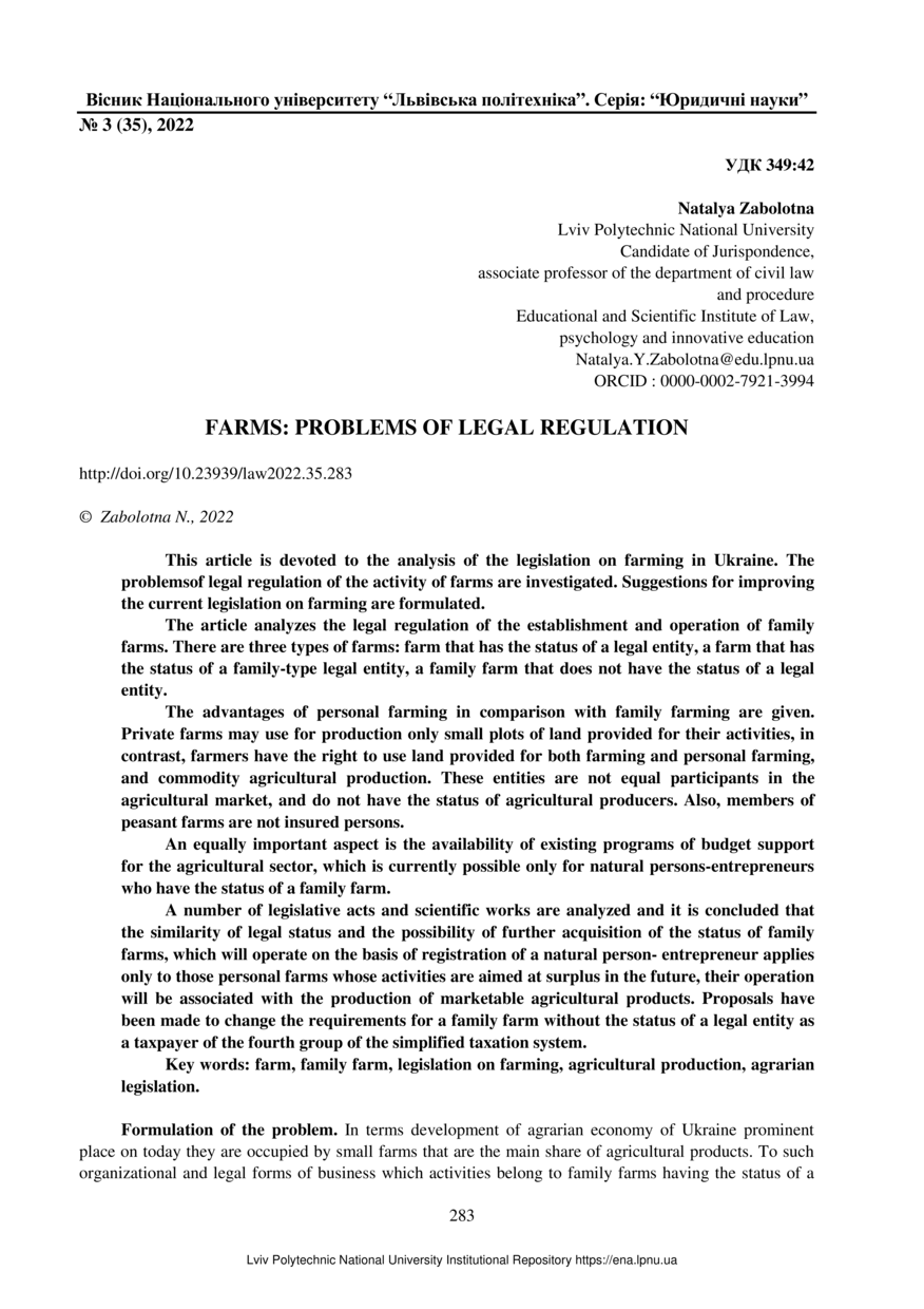 Zabolotna N. Farms: problems of legal regulation / Natalya Zabolotna // Вісник Національного університету “Львівська політехніка”. Серія: “Юридичні науки”. — Lviv : Lviv Politechnic Publishing House, 2022. — Vol 9. — No 3 (35). — P. 283–288.
