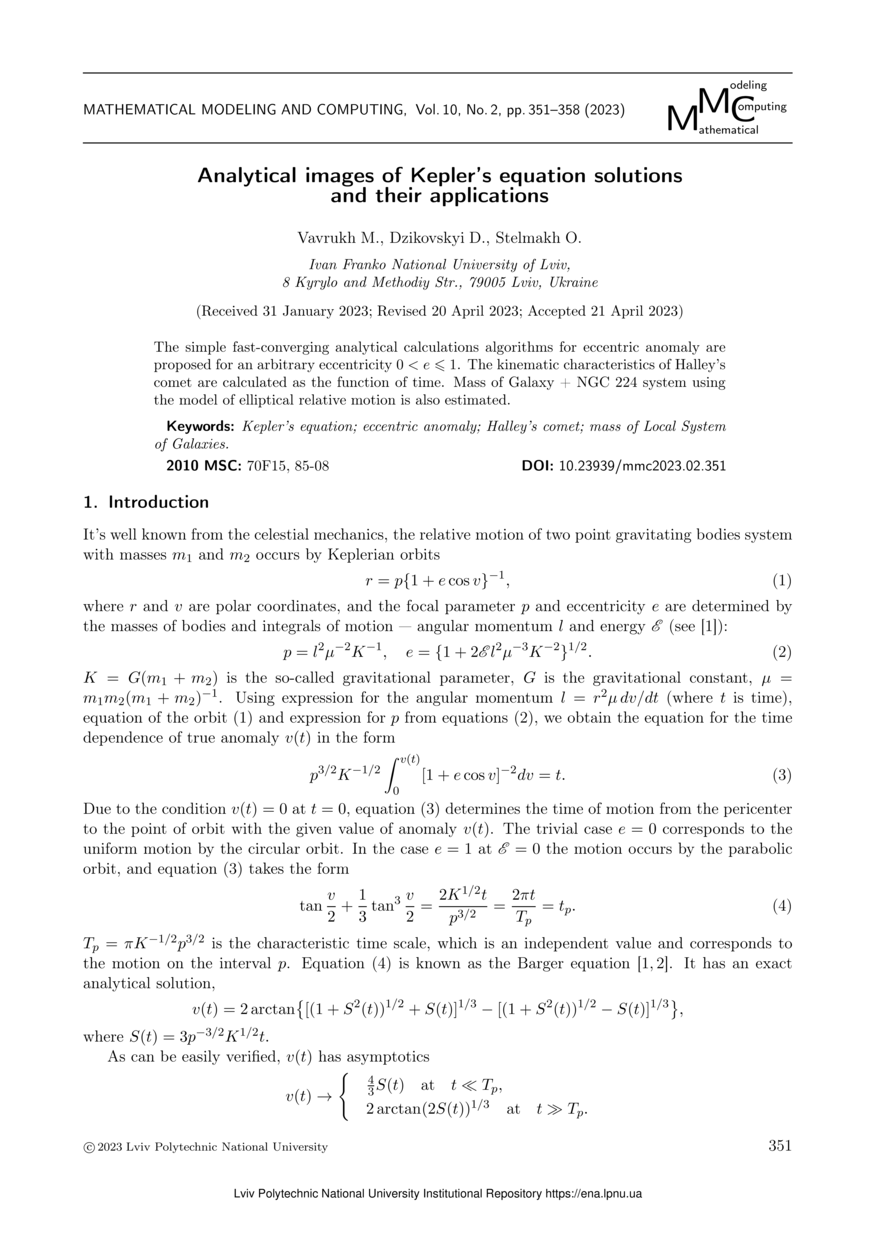 Vavrukh M. Analytical images of Kepler’s equation solutions and their applications / M. Vavrukh, D. Dzikovskyi, O. Stelmakh // Mathematical Modeling and Computing. — Lviv : Lviv Politechnic Publishing House, 2023. — Vol 10. — No 2. — P. 351–358.