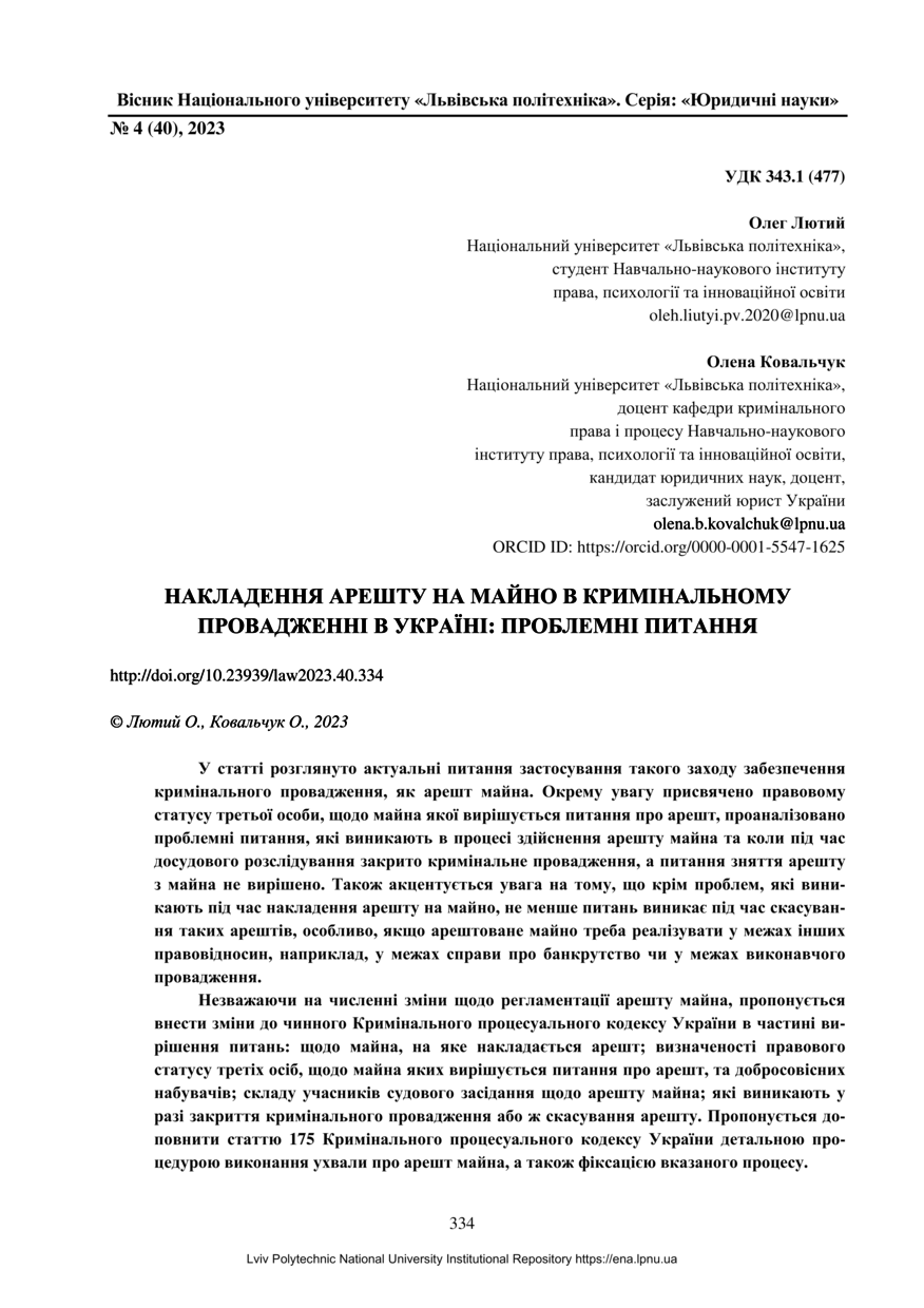 Лютий О. Накладення арешту на майно в кримінальному провадженні в Україні: проблемні питання / Олег Лютий, Олена Ковальчук // Вісник Національного університету «Львівська політехніка». Серія: Юридичні науки. — Львів : Видавництво Львівської політехніки, 2023. — № 4 (40). — С. 334–341.