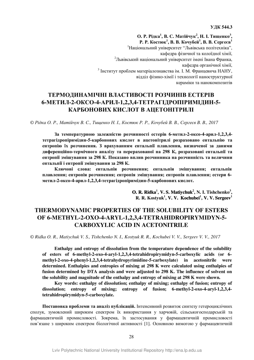 | dc.identifier.citationen | Thermodynamic properties of the solubility of esters of 6-methyl-2-oxo-4-aryl-1,2,3,4-tetrahidropirymidyn-5-carboxylic acid in acetonitrile / O. R. Ridka, V. S. Matiychuk, N. I. Tishchenko, R. R. Kostyuk, V. V. Kochubei, V. V. Sergeev // Visnyk natsionalnoho universytetu "Lvivska politekhnika". Serie: Khimiia, tekhnolohiia rechovyn ta yikh zastosuvannia. — Vydavnytstvo Lvivskoi politekhniky, 2018. — No 886. — P. 28–33. — (Analitychna khimiia. Fizychna ta koloidna khimiia. Neorhanichna khimiia. orhanichna khimiia). | |