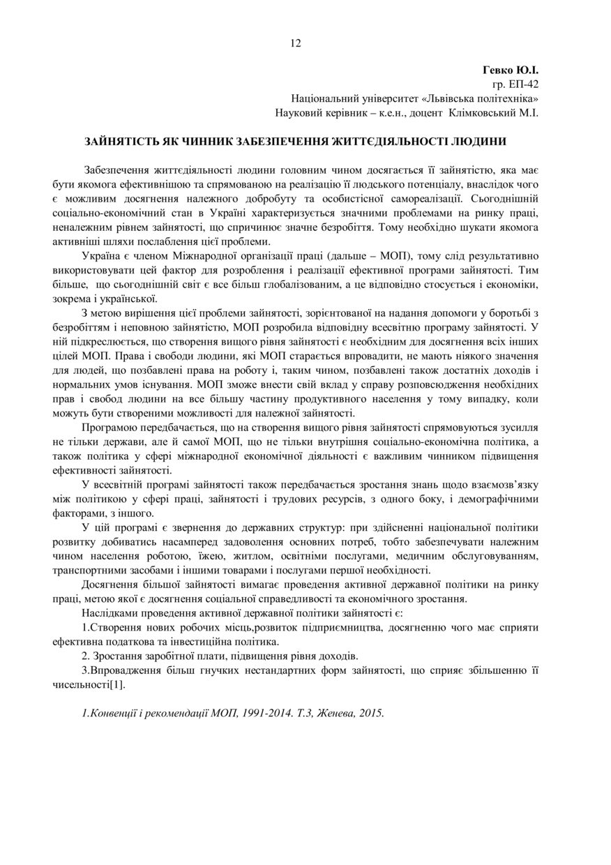 Гевко Ю. І. Зайнятість як чинник забезпечення життєдіяльності людини / Ю. І. Гевко, М. І. Клімковський // Цілі сталого розвитку у вітчизняних реаліях: студентський погляд на проблему : тези доповідей ІІІ Всеукраїнської студентської науково-практичної конференції, 19–20 квітня 2018 року, Львів. — Львів : Видавництво Львівської політехніки, 2018. — С. 12. — (Людина та забезпечення її життєдіяльності).