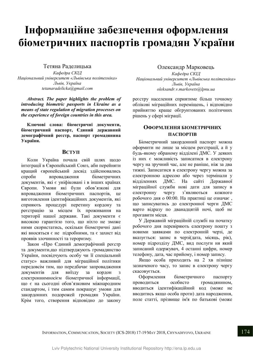 | dc.identifier.citation | Раделицька Т. Інформаційне забезпечення оформлення біометричних паспортів громадян України / Тетяна Раделицька, Олександр Марковець // Інформація, комунікація, суспільство : матеріали 7-ї Міжнародної наукової конференції, 17–19 травня 2018 року, Чинадієво. — Львів : Видавництво Львівської політехніки, 2018. — С. 174–175. — (Документознавство та інформаційна діяльність у системі сучасних наукових досліджень). | |