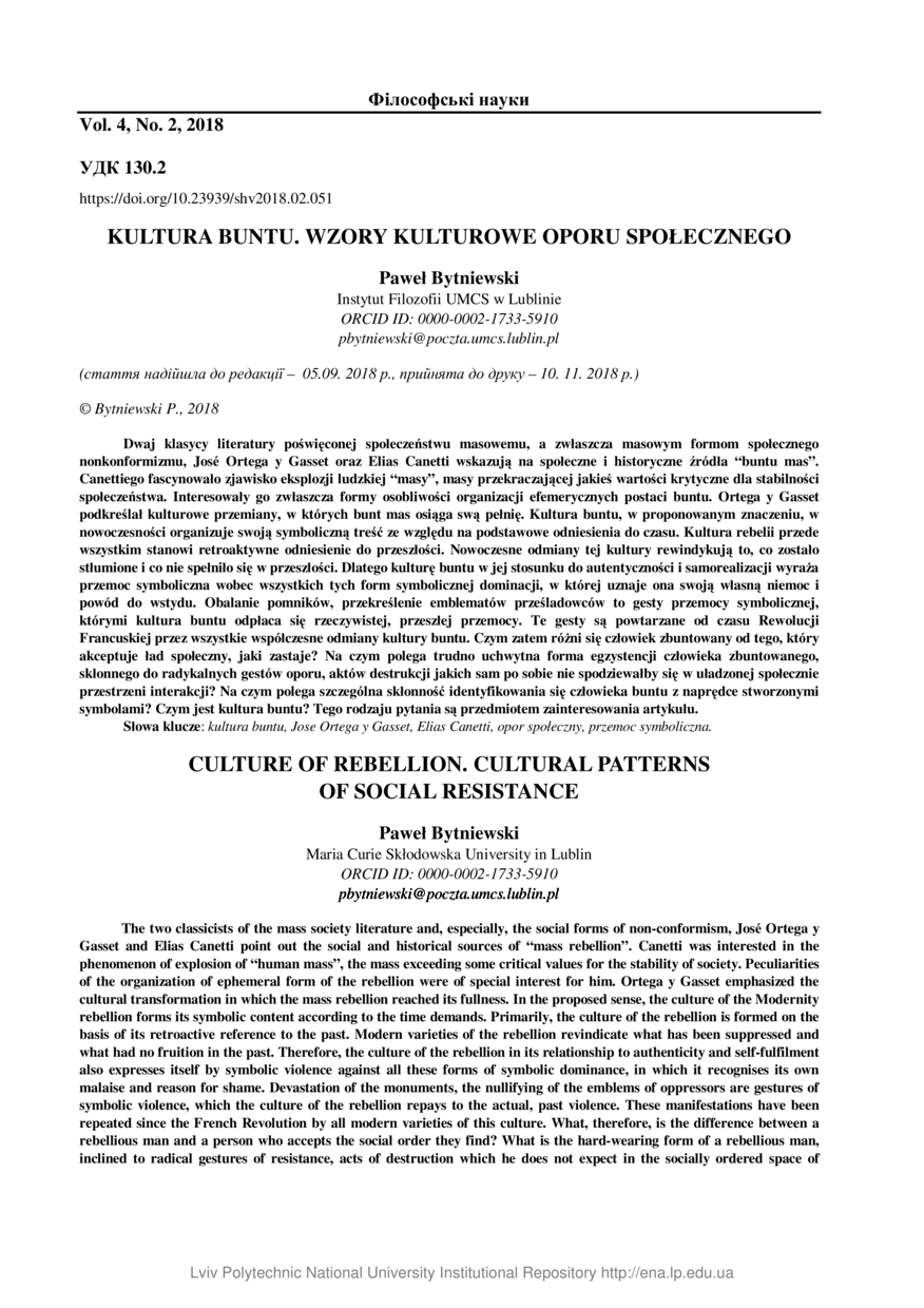 Bytniewski P. Kultura buntu. Wzory kulturowe oporu społecznego / Paweł Bytniewski // Гуманітарні візіїї. — Львів : Видавництво Львівської політехніки, 2018. — Том 4. — № 2. — С. 51–55.
