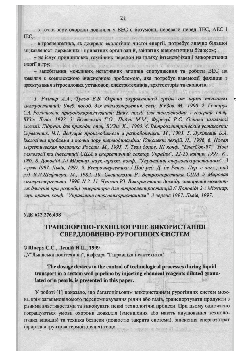 Шнерх С. С. Транспортно-технологічне використання свердловинно-рурогінних систем / Шнерх С. С., Лещій Н. П. // Вісник Державного університету «Львівська політехніка». Серія: Теплоенергетика. Інженерія довкілля. Автоматизація. — Львів : Видавництво Державного університету “Львівська політехніка”, 1999. — № 378. — С. 21–25. — (Інженерія довкілля).