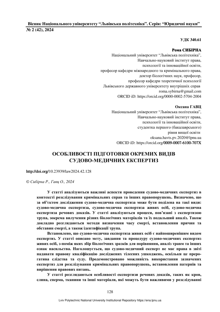 | dc.identifier.citationen | Sybirna R. Peculiarities of preparation of certain types of forensic examinations / Roma Sybirna, Oksana HAVTS // Bulletin of Lviv Polytechnic National University. Series: Legal Sciences. — Lviv : Lviv Politechnic Publishing House, 2024. — No 2 (42). — P. 128–139. | |