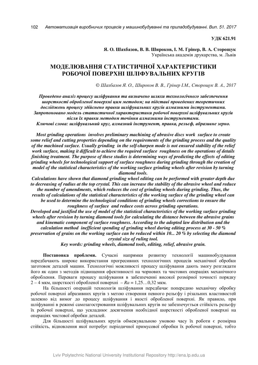 Моделювання статистичної характеристики робочої поверхні шліфувальних кругів / Я. О. Шахбазов, В. В. Широков, І. М. Грінер, В. А. Сторощук // Автоматизація виробничих процесів у машинобудуванні та приладобудуванні : український міжвідомчий науково-технічний збірник. — Львів : Видавництво Львівської політехніки, 2017. — Том 51. — С. 102–107.