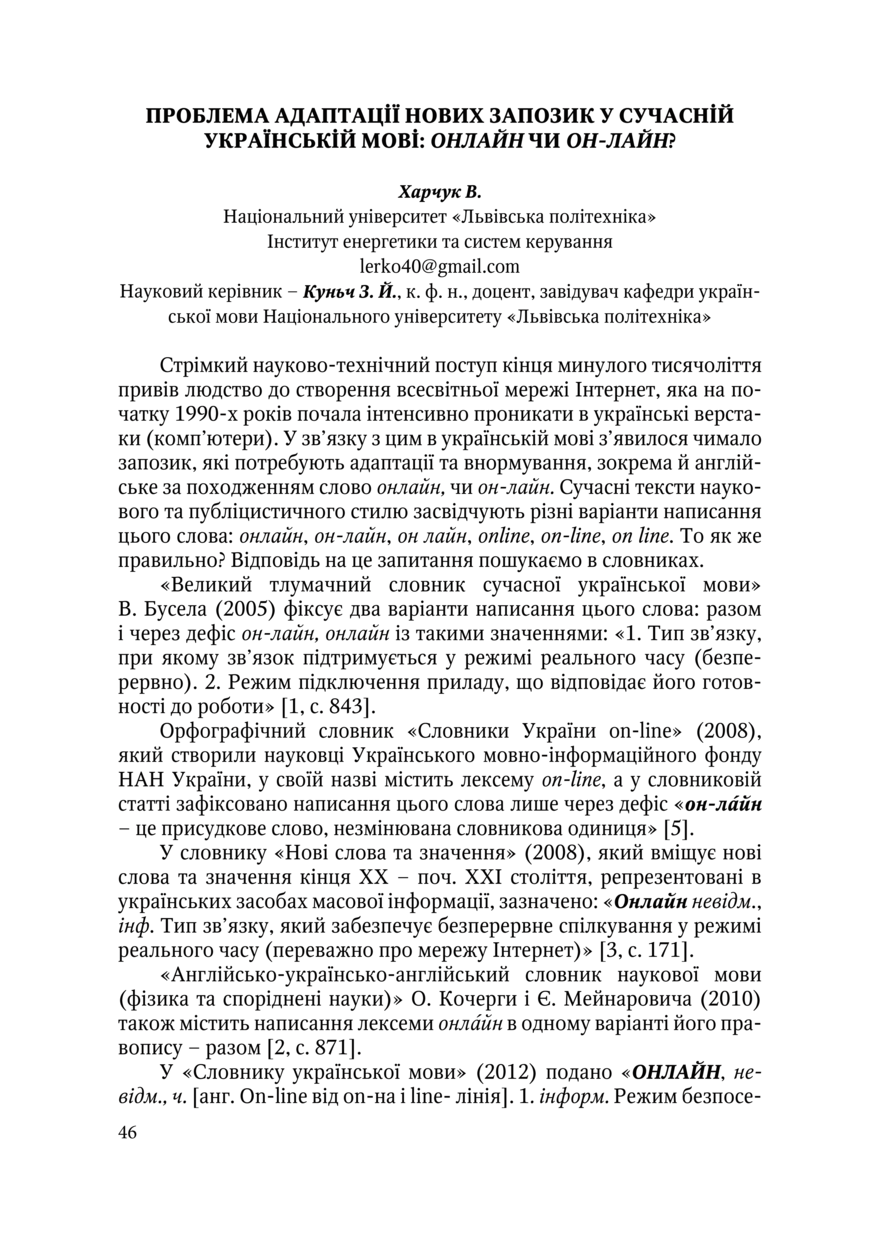 Харчук В. Проблема адаптації нових запозик у сучасній українській мові: онлайн чи он-лайн? / В. Харчук, З. Й. Куньч // Українська мова в просторі й часі : матеріали Всеукраїнської студентської науково-практичної конференції, 17–19 квітня 2019 року, Львів. — Львів : Видавництво Львівської політехніки, 2019. — С. 46–47. — (Проблеми дотримання норм сучасної української мови).