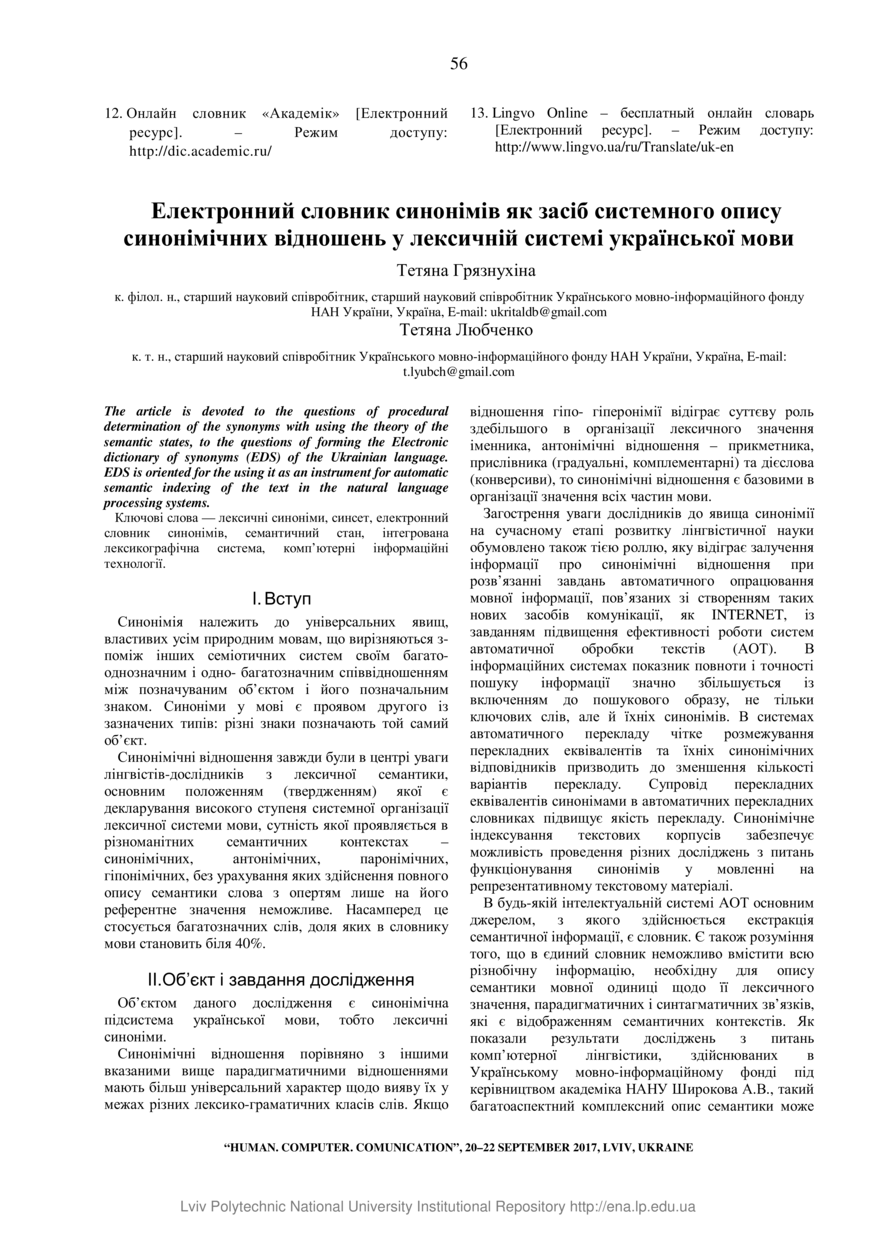 | dc.identifier.citation | Грязнухіна Т. Електронний словник синонімів як засіб системного опису синонімічних відношень у лексичній системі української мови / Тетяна Грязнухіна, Тетяна Любченко // Людина. Комп’ютер. Комунікація : збірник наукових праць. — Львів : Видавництво Львівської політехніки, 2017. — С. 56–60. — (3. Класична й комп’ютерна лексикографія). | |