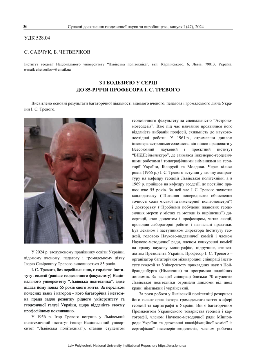 Савчук С. З геодезією у серці до 85-річчя професора І. С. Тревого / С. Савчук, Б. Четверіков // Сучасні досягнення геодезичної науки та виробництва. — Львів : Видавництво Львівської політехніки, 2024. — Том 1. — № 47. — С. 36–37.