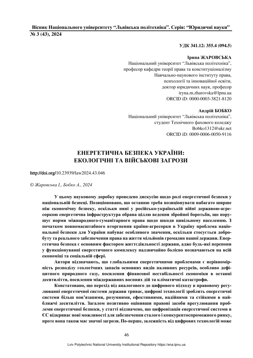 Жарсовська І. Енергетична безпека України: екологічні та військові загрози / Ірина Жарсовська, Андрій Бобко // Вісник Національного університету “Львівська політехніка”. Серія: “Юридичні науки”. — Львів : Видавництво Львівської політехніки, 2024. — № 3(43). — С. 46–51.