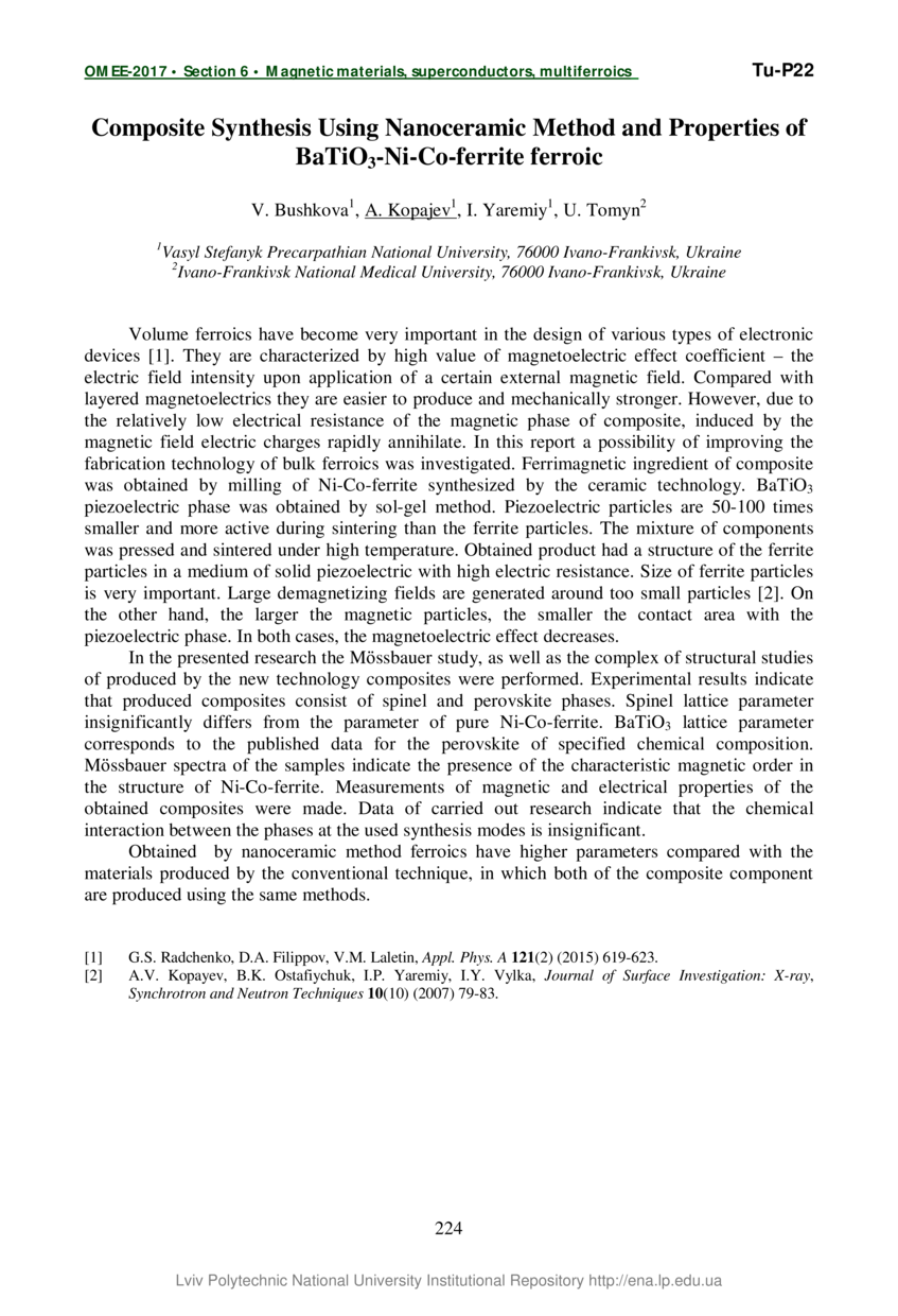 | dc.identifier.citationen | Composite Synthesis Using Nanoceramic Method and Properties of BaTiO3-Ni-Co-ferrite ferroic / V. Bushkova, A. Kopajev, I. Yaremiy, U. Tomyn // Oxide Materials for Electronic Engineering – fabrication, properties and applications : book of abstracts international conference, May 29–June 2, 2017 Lviv, Ukraine. — Lviv, 2017. — P. 224. — (6 magnetic materials, superconductors, multiferroics). | |