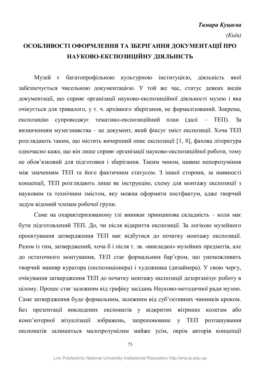 | dc.identifier.citationen | Kutsaieva T. Osoblyvosti oformlennia ta zberihannia dokumentatsii pro naukovo-ekspozytsiinu diialnist / Tamara Kutsaieva // Istoryko-kulturna spadshchyna: yevropeiskyi vymir : tezy Vseukrainskoi naukovo-praktychnoi konferentsii, 1 chervnia, 2018 roku, Lviv. — Lviv : Interprint, 2018. — P. 73–77. | |