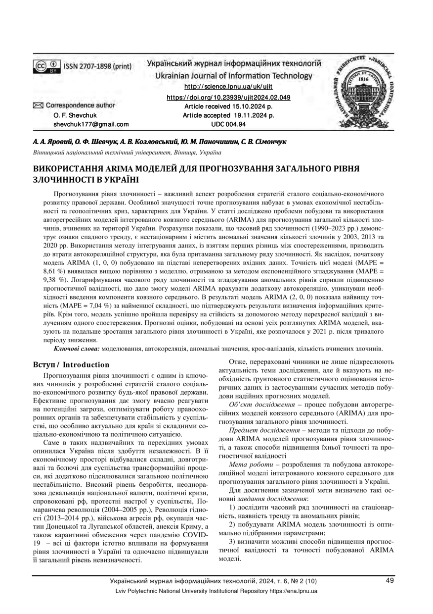 Використання ARIMA моделей для прогнозування загального рівня злочинності в Україні / А. А. Яровий, О. Ф. Шевчук, А. В. Козловський, Ю. М. Паночишин, С. В. Сімончук // Український журнал інформаційних технологій. — Львів : Видавництво Львівської політехніки, 2024. — Том 6. — № 2. — С. 49–56.