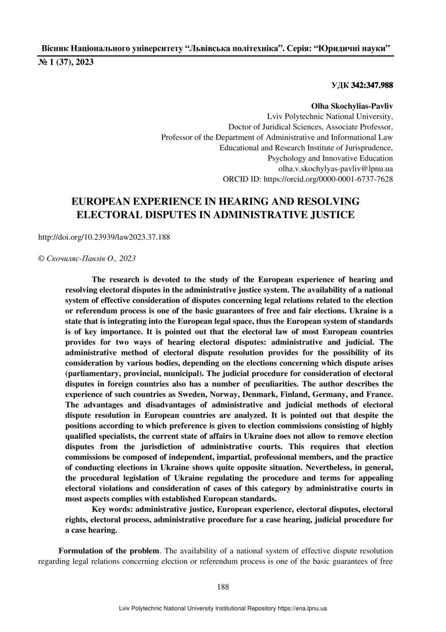 | dc.identifier.citationen | Skochylias-Pavliv O. European experience in hearing and resolving electoral disputes in administrative justice / Skochylias-Pavliv Olha // Visnyk Natsionalnoho universytetu "Lvivska politekhnika". Serie: Yurydychni nauky. — Lviv : Lviv Politechnic Publishing House, 2023. — No 1(37). — P. 188–194. | |