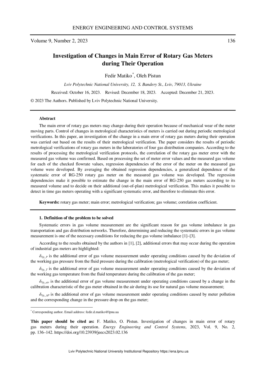 | dc.identifier.citation | Matiko F. Investigation of Changes in Main Error of Rotary Gas Meters during Their Operation / Fedir Matiko, Oleh Pistun // Energy Engineering and Control Systems. — Lviv : Lviv Politechnic Publishing House, 2023. — Vol 9. — No 2. — P. 136–142. | |