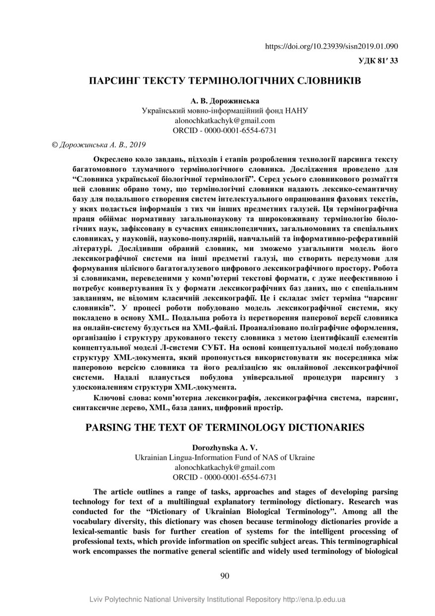Дорожинська А. В. Парсинг тексту термінологічних словників / А. В. Дорожинська // Вісник Національного університету "Львівська політехніка". Інформаційні системи та мережі. — Львів : Видавництво Львівської політехніки, 2019. — № 5. — С. 90–100.