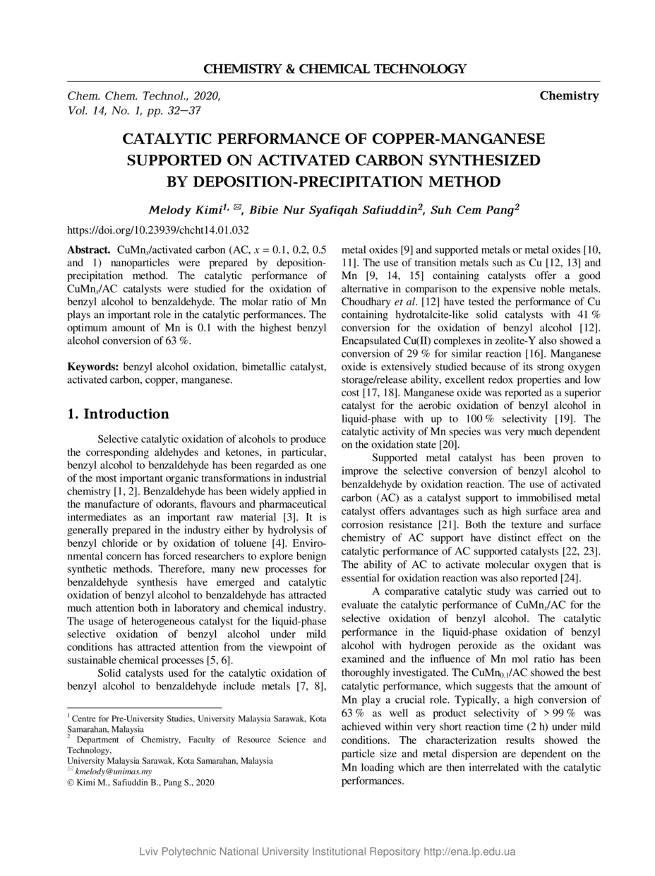 | dc.identifier.citation | Kimi M. Catalytic Performance of Copper-Manganese Supported on Activated Carbon Synthesized by Deposition-Precipitation Method / Melody Kimi, Bibie Nur Syafiqah Safiuddin, Suh Cem Pang // Chemistry & Chemical Technology. — Lviv : Lviv Politechnic Publishing House, 2020. — Vol 14. — No 1. — P. 32–37. | |