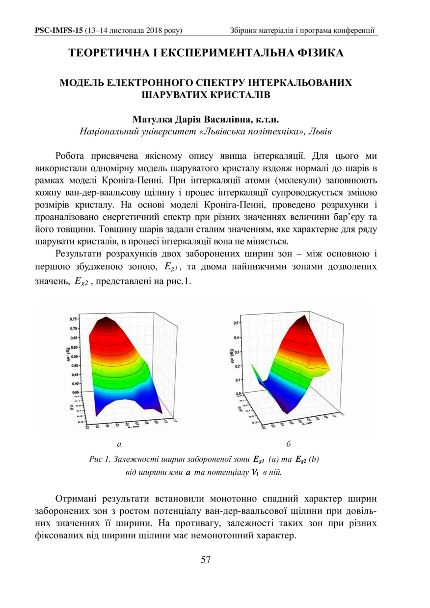 Матулка Д. В. Модель електронного спектру інтеркальованих шаруватих кристалів / Д. В. Матулка // 15-та Відкрита наукова конференція Інституту прикладної математики та фундаментальних наук (ІМФН) : збірник матеріалів і програма конференції, 13–14 листопада 2018 року, Львів. — Львів : Видавництво Львівської політехніки, 2018. — С. 57. — (Теоретична і експериментальна фізика).