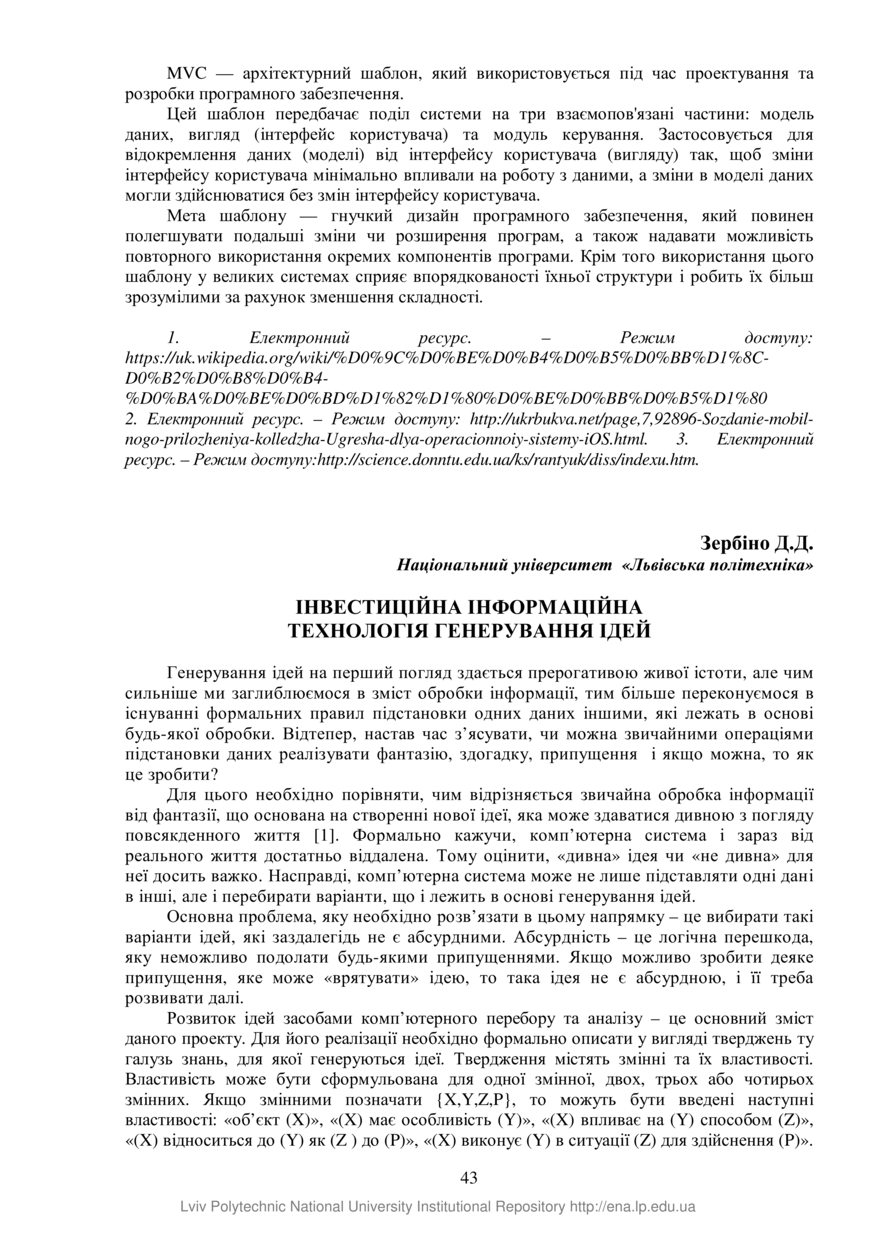 Зербіно Д. Д. Інвестиційна інформаційна технологія генерування ідей / Д. Д. Зербіно // Проблеми та перспективи розвитку економіки і підприємництва та комп’ютерних технологій в Україні : збірник тез доповідей ХIV Науково-практичної конференції, 17-20 квітня 2018 року. — Львів : Видавництво Львівської політехніки, 2018. — С. 43–44. — (IT: технології, розробки, тренди).