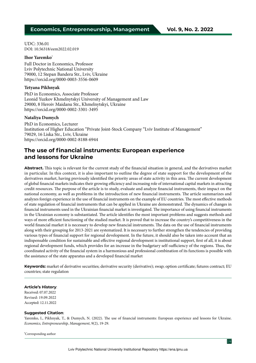 Yaremko I. The use of financial instruments: European experience and lessons for Ukraine / Yaremko Ihor, Pikhnyak Tetyana, Dumych Nataliya // Economics, Entrepreneurship, Management. — Lviv : Lviv Politechnic Publishing House, 2022. — Vol 9. — No 2. — P. 19–29.