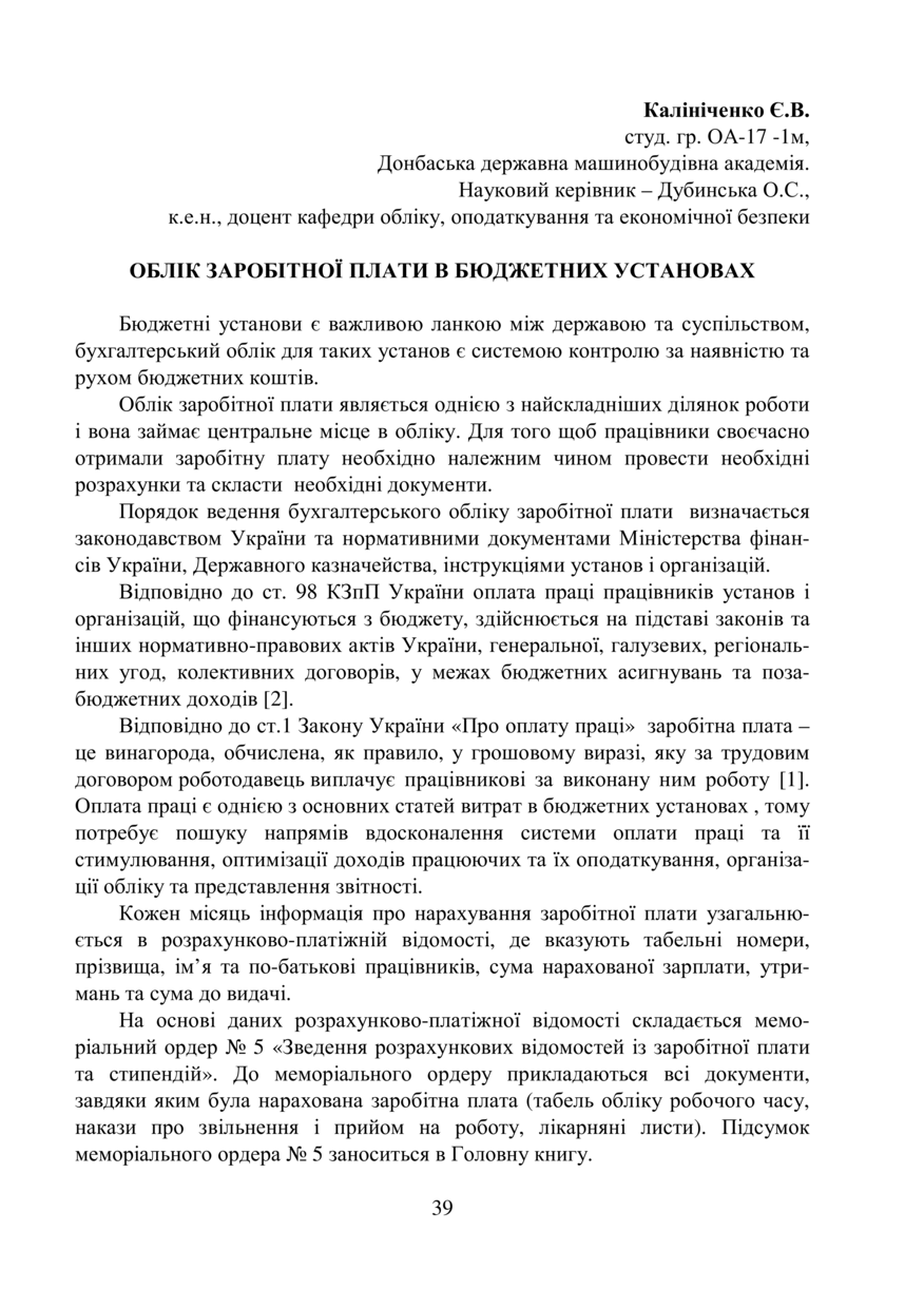 Калініченко Є. В. Облік заробітної плати в бюджетних установах / Є. В. Калініченко, О. С. Дубинська // Облік, аналіз і контроль в системі управління суб’єктами економіки : тези доповідей ІV Міжнародної студентської наукової конференції, 18–19 жовтня 2018 року, Львів. — Львів : Видавництво Львівської політехніки, 2018. — С. 39–40. — (Актуальні проблеми бухгалтерського, управлінського та податкового обліку і шляхи їх вирішення).