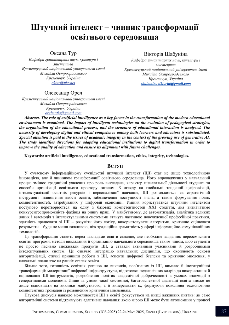 | dc.identifier.citationen | Tur O. Shtuchnyi intelekt – chynnyk transformatsii osvitnoho seredovyshcha / Oksana Tur, Viktoriia Shabunina, Oleksandr Orel // Informatsiia, komunikatsiia, suspilstvo 2025: ICS-2025 : materialy XIV Mizhnarodnoi naukovoi konferentsii, 22-24 travnia 2025 roku, Lviv. — Lviv : Lviv Politechnic Publishing House, 2025. — P. 87–88. — (Systemy shtuchnoho intelektu ta mashynne navchannia). | |
