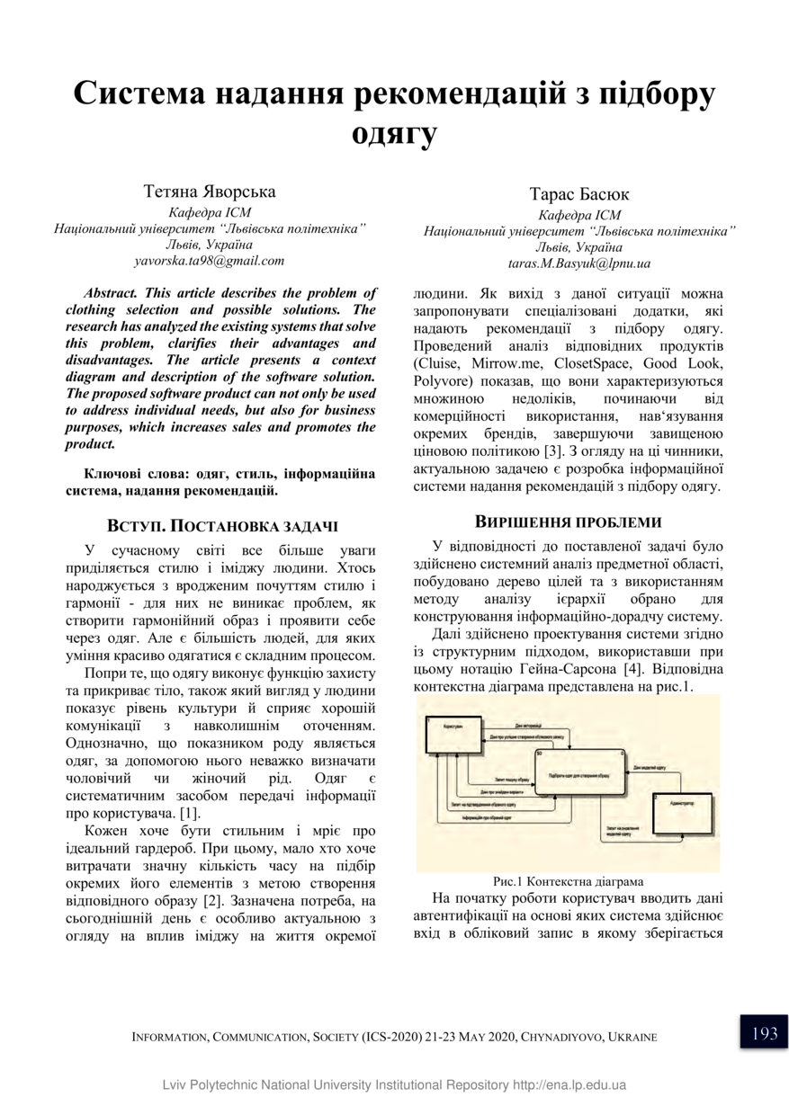 Яворська Т. Система надання рекомендацій з підбору одягу / Тетяна Яворська, Тарас Басюк // Інформація, комунікація, суспільство 2020 : матеріали 9-ї Міжнародної наукової конференції, 21–23 травня 2020 року, Львів. — Львів : Видавництво Львівської політехніки, 2020. — С. 193–194. — (Технології інформаційного менеджменту та інтелектуального опрацювання даних).