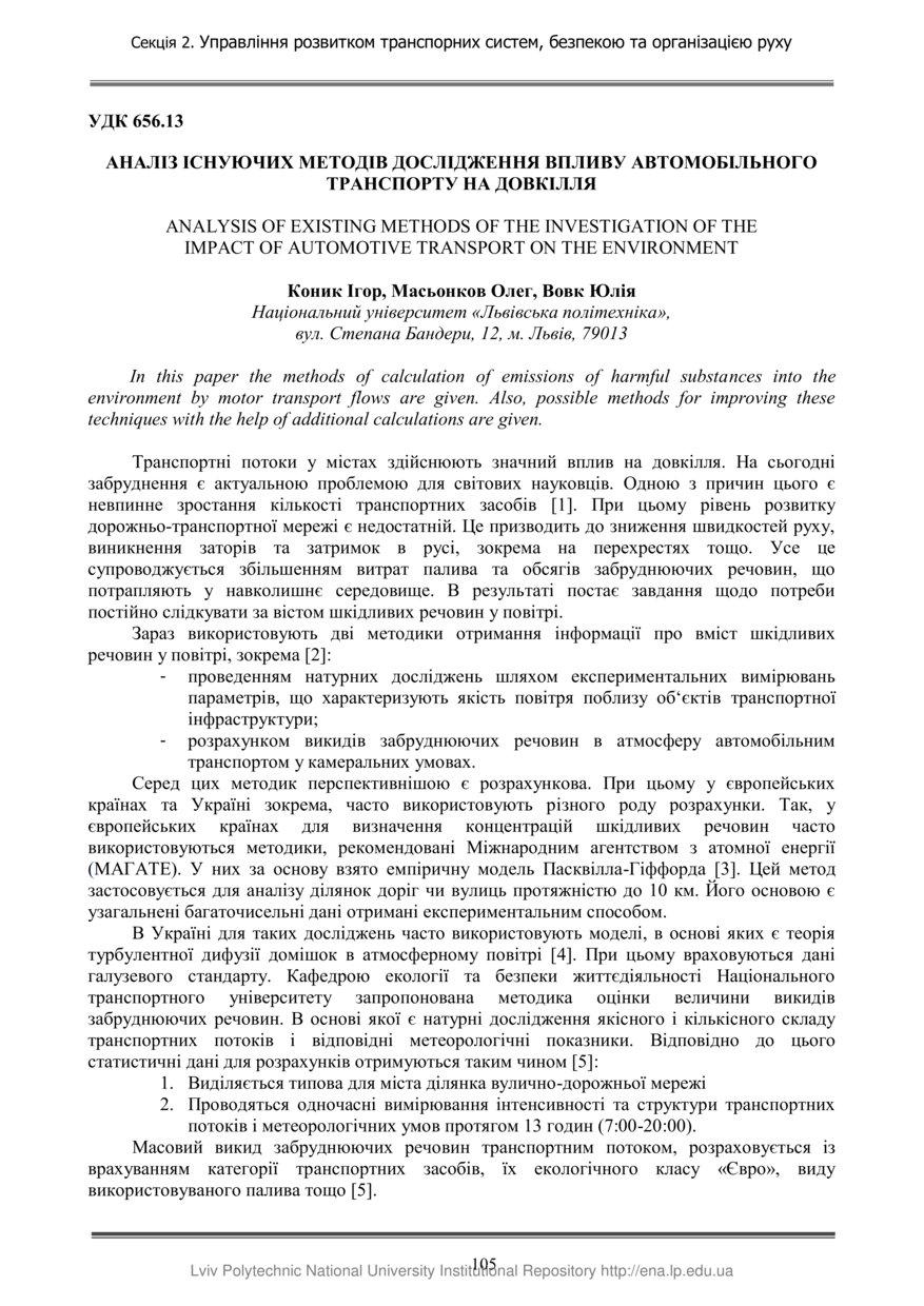 Коник І. Аналіз існуючих методів дослідження впливу автомобільного транспорту на довкілля / Ігор Коник, Олег Масьонков, Юлія Вовк // Проблеми з транспортними потоками і напрями їх розв’язання : тези доповідей ІІІ Всеукраїнської науково-теоретичної конференції, 28 – 30 березня 2019 року, Львів. — Дрогобич : Посвіт, 2019. — С. 105–106. — (УПравління розвитком транспорних систем, безпекою та організацією руху).