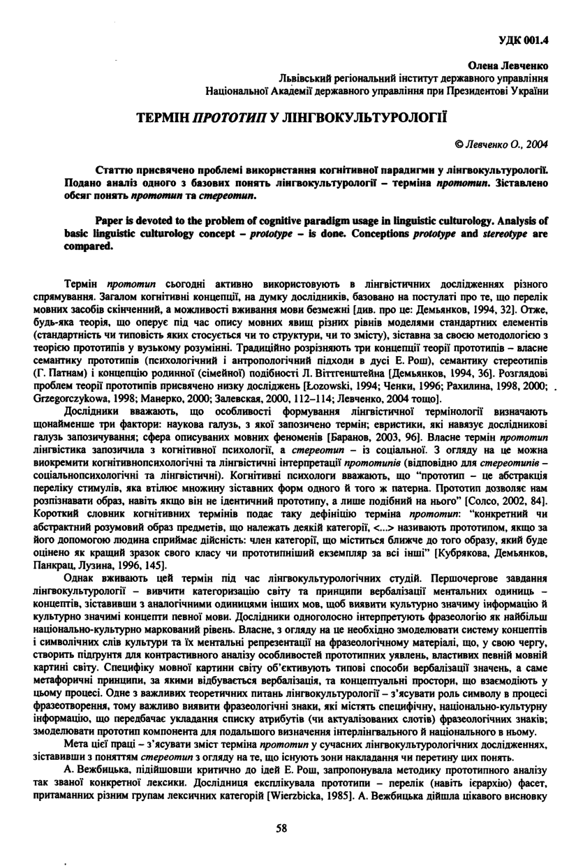 Левченко О. Термін прототип у лінгвокультурології / О. Левченко // Вісник Національного університету “Львівська політехніка”. — Львів : Видавництво Національного університету “Львівська політехніка”, 2004. — № 503 : Проблеми української термінології. — С. 58–60.