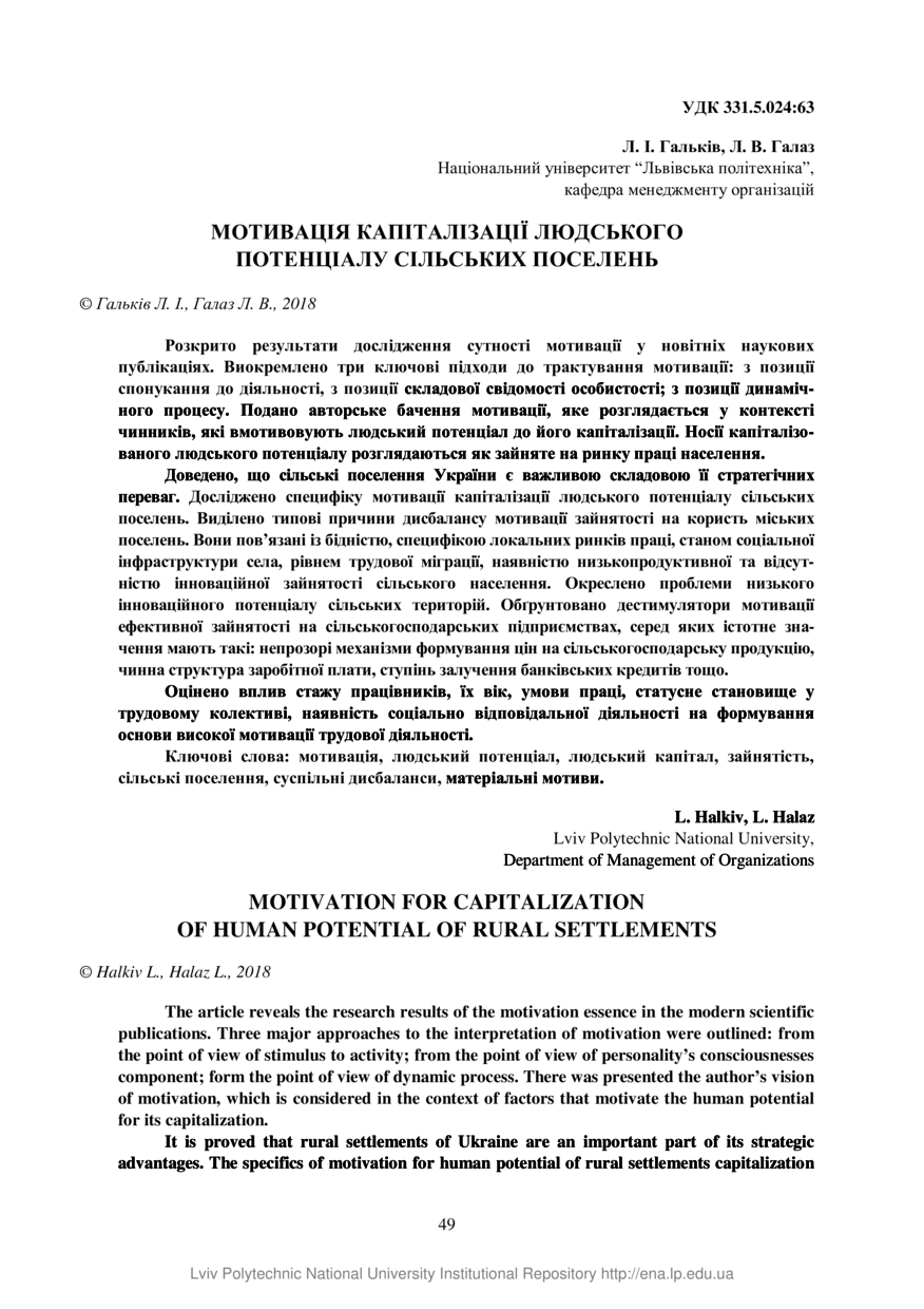 Гальків Л. І. Мотивація капіталізації людського потенціалу сільських поселень / Л. І. Гальків, Л. В. Галаз // Вісник Національного університету “Львівська політехніка”. Серія: Проблеми економіки та управління. — Львів : Видавництво Львівської політехніки, 2018. — № 897, випуск 2. — С. 49–56. — (Проблеми управління).