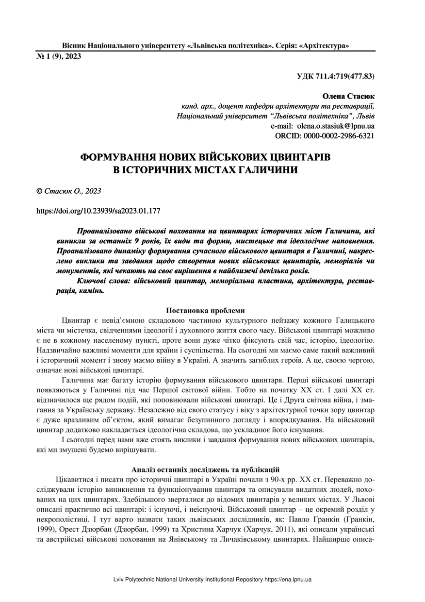 Стасюк О. Формування нових військових цвинтарів в історичних містах Галичини / Олена Стасюк // Вісник Національного університету "Львівська політехніка". Серія: Архітектура. — Львів : Видавництво Львівської політехніки, 2023. — Том 5. — № 1. — С. 177–184.