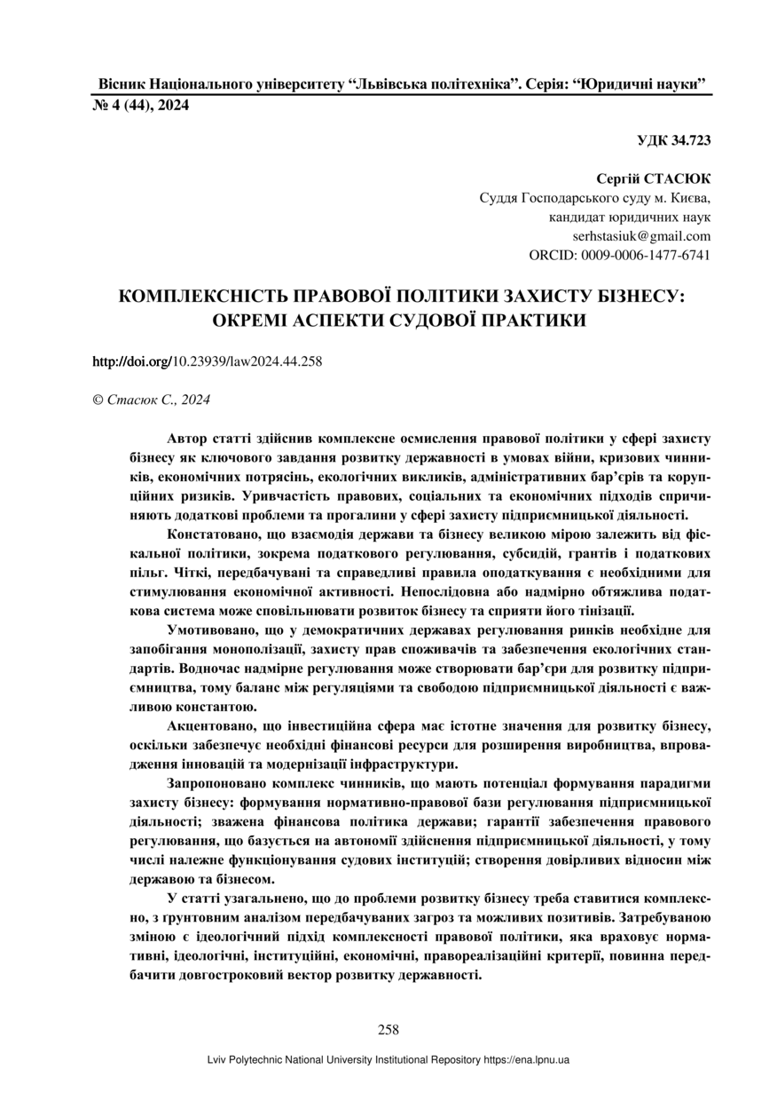 Стасюк С. Комплексність правової політики захисту бізнесу: окремі аспекти судової практики / Сергій Стасюк // Вісник Національного університету “Львівська політехніка”. Серія: “Юридичні науки”. — Львів : Видавництво Львівської політехніки, 2024. — № 4(44). — С. 258–264.