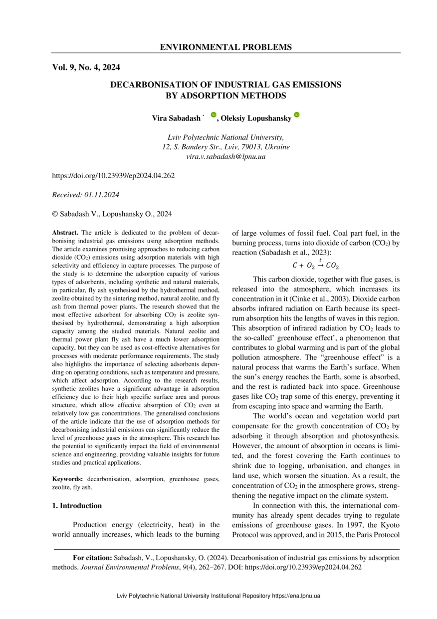 | dc.description.abstract | The article is dedicated to the problem of decarbonising industrial gas emissions using adsorption methods. The article examines promising approaches to reducing carbon dioxide (CO₂) emissions using adsorption materials with high selectivity and efficiency in capture processes. The purpose of the study is to determine the adsorption capacity of various types of adsorbents, including synthetic and natural materials, in particular, fly ash synthesised by the hydrothermal method, zeolite obtained by the sintering method, natural zeolite, and fly ash from thermal power plants. The research showed that the most effective adsorbent for absorbing CO₂ is zeolite synthesised by hydrothermal, demonstrating a high adsorption capacity among the studied materials. Natural zeolite and thermal power plant fly ash have a much lower adsorption capacity, but they can be used as cost-effective alternatives for processes with moderate performance requirements. The study also highlights the importance of selecting adsorbents depending on operating conditions, such as temperature and pressure, which affect adsorption. According to the research results, synthetic zeolites have a significant advantage in adsorption efficiency due to their high specific surface area and porous structure, which allow effective absorption of CO₂ even at relatively low gas concentrations. The generalised conclusions of the article indicate that the use of adsorption methods for decarbonising industrial emissions can significantly reduce the level of greenhouse gases in the atmosphere. This research has the potential to significantly impact the field of environmental science and engineering, providing valuable insights for future studies and practical applications. | |