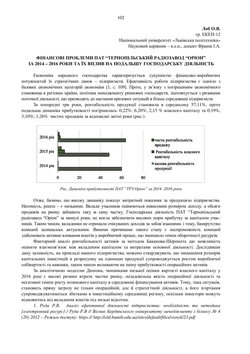 Лоб О. Я. Фінансові проблеми ПАТ “Тернопільський радіозавод “ОРІОН” за 2014 – 2016 роки та їх вплив на подальшу господарську діяльність / О. Я. Лоб, І. А. Франів // Цілі сталого розвитку у вітчизняних реаліях: студентський погляд на проблему : тези доповідей ІІІ Всеукраїнської студентської науково-практичної конференції, 19–20 квітня 2018 року, Львів. — Львів : Видавництво Львівської політехніки, 2018. — С. 102. — (Економіка: ефективність, раціональність, безпечність).