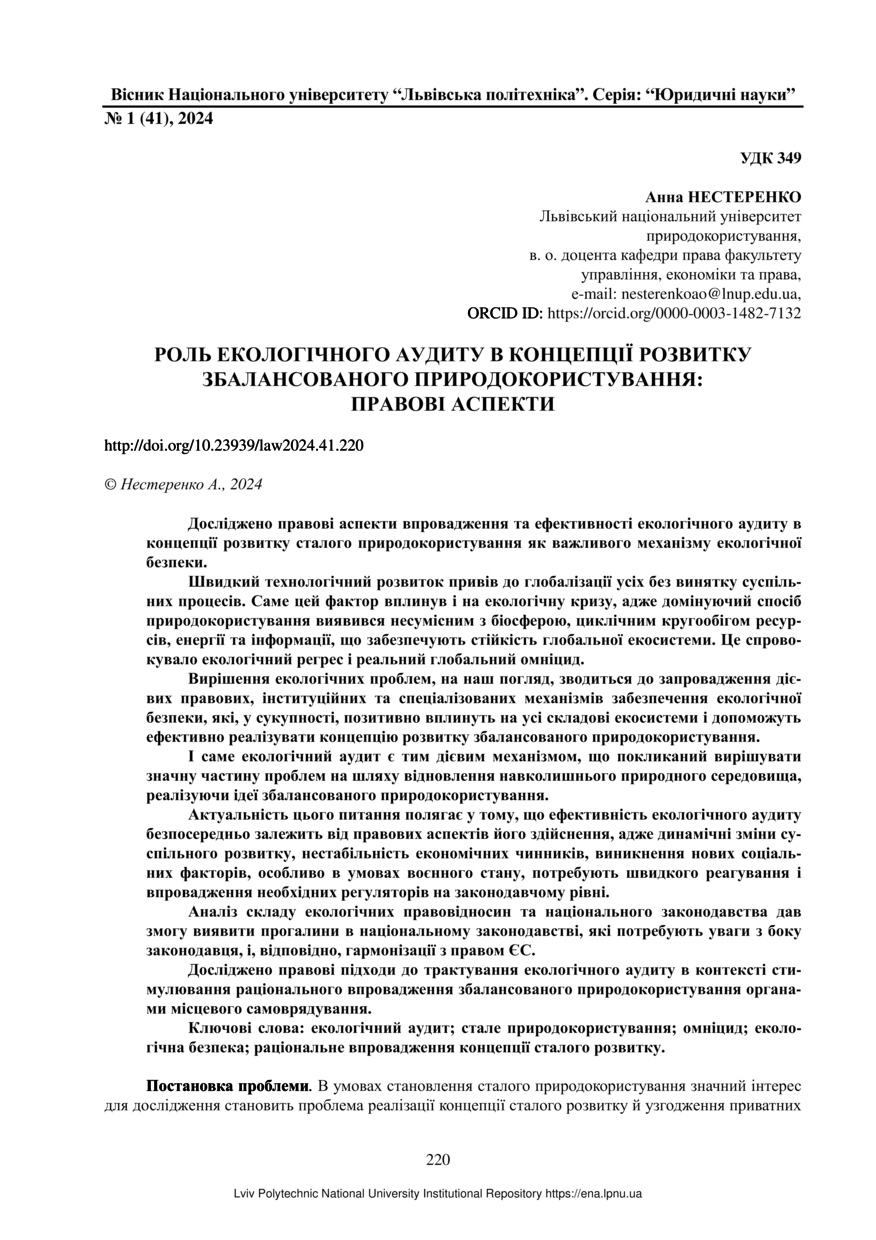 Роль екологічного аудиту в концепції розвитку збалансованого природокористування: правові аспекти