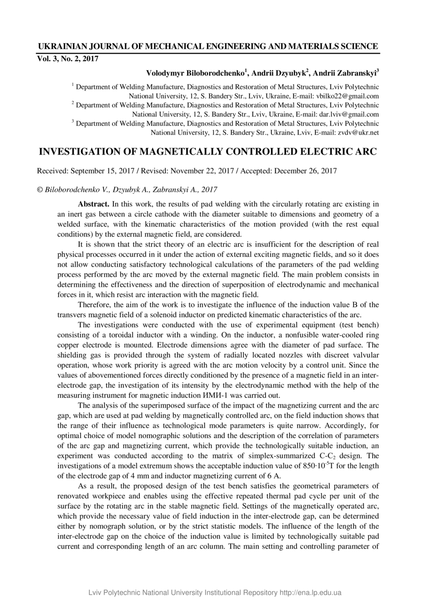 Biloborodchenko V. Investigation of magnetically controlled electric arc / Volodymyr Biloborodchenko, Andrii Dzyubyk, Andrii Zabranskyi // Ukrainian Journal of Mechanical Engineering and Materials Science. — Lviv : Lviv Politechnic Publishing House, 2017. — Vol 3. — No 2. — P. 55–66.